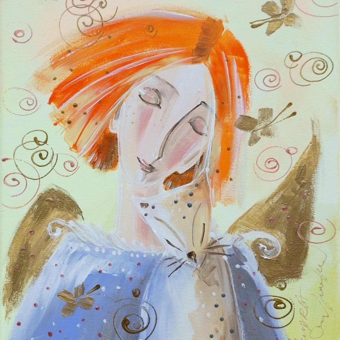 Anioł rudy i kotka.. Szkatułka 16x16 cm