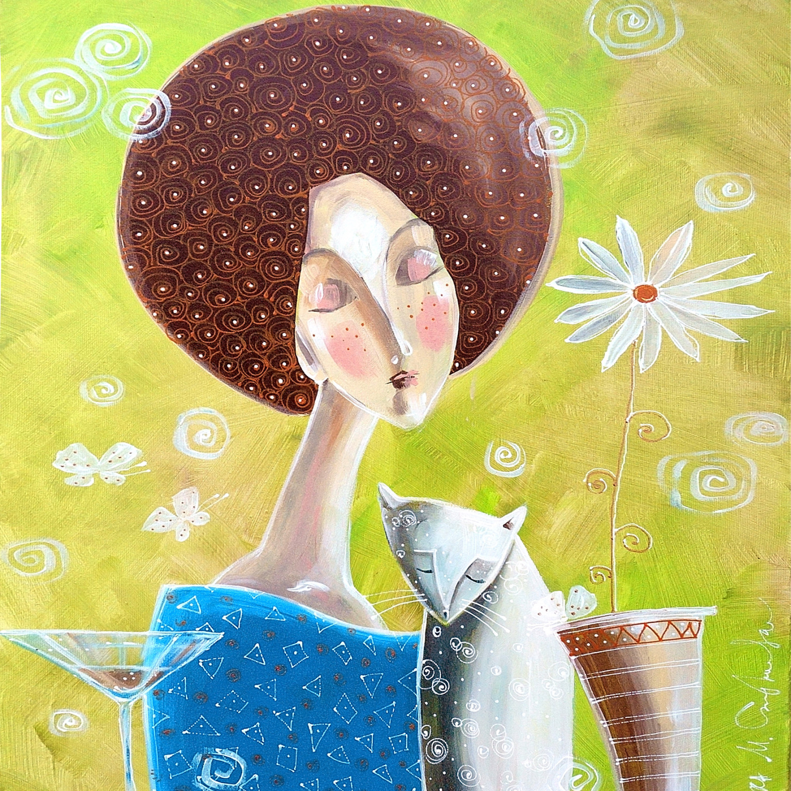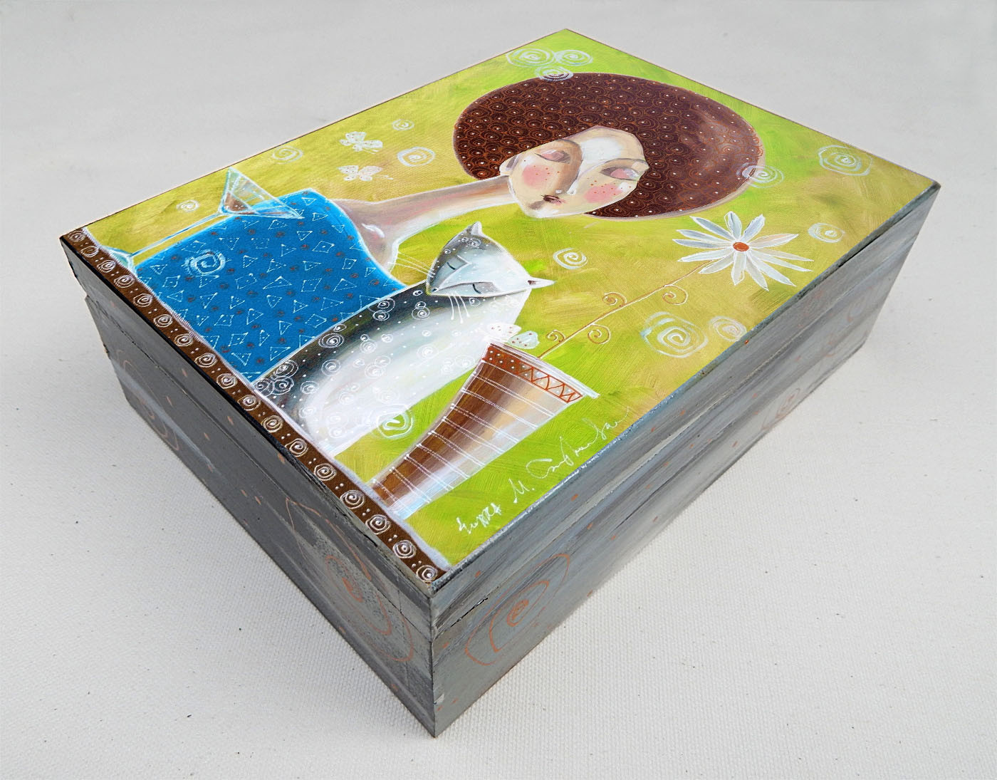 Drewniane pudełko na różności z reprodukcją obrazu autorskiego, noszącego tytuł „Chwila spokojnej melancholii”. Reprodukcja umieszczona jest metodą decoupage na wierzchniej części, boki szkatułki natomiast malowane są ręcznie, a całość zabezpieczona jest bezbarwnym lakierem oraz sygnowana w środku.