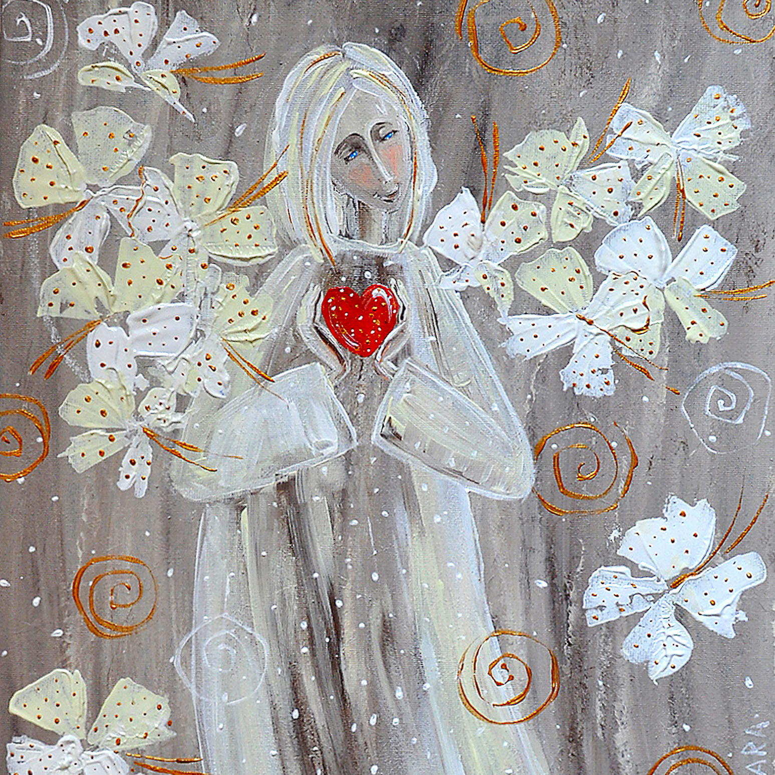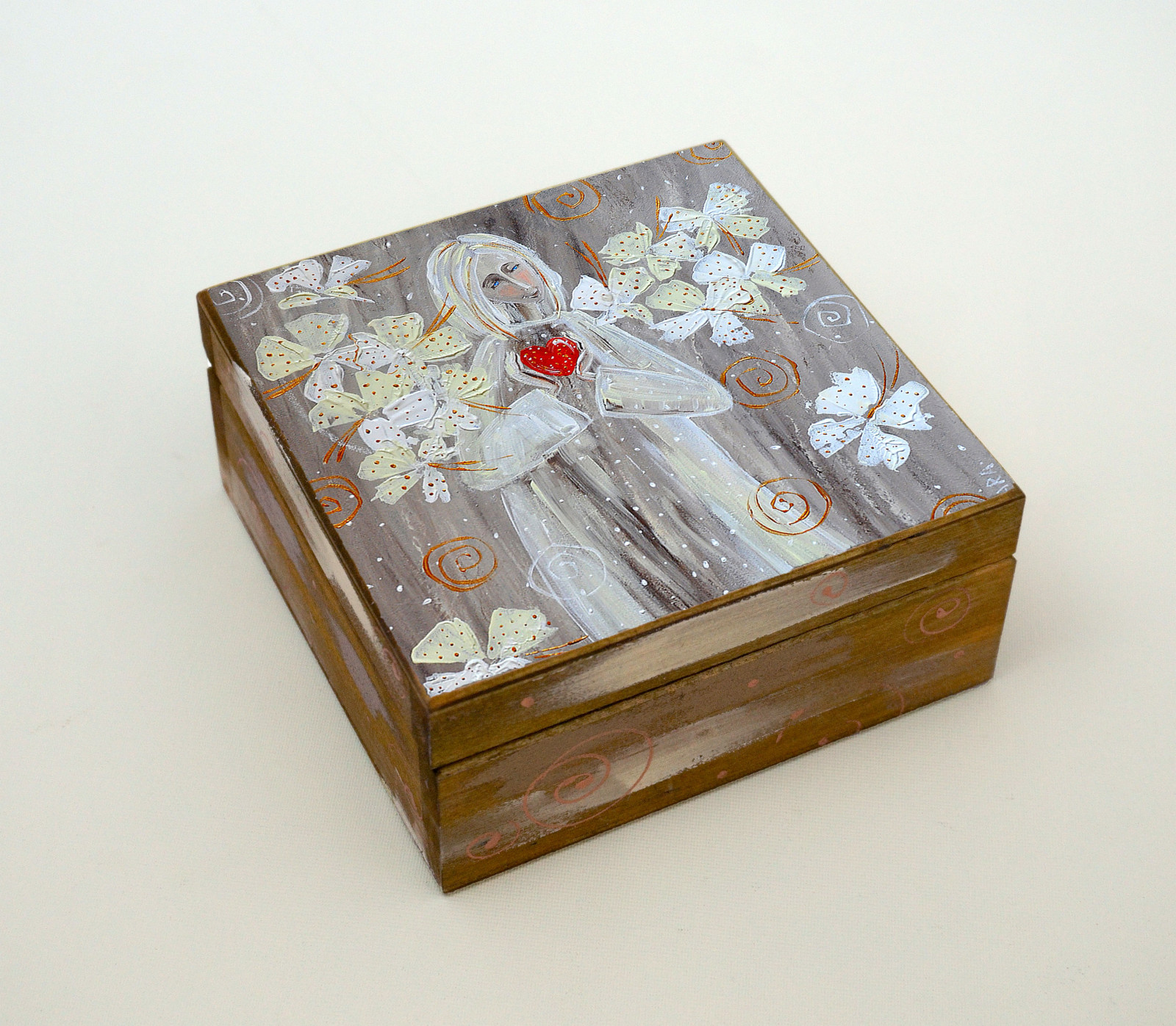 Drewniane pudełko na różności z reprodukcją obrazu autorskiego zatytułowanego Z całego serca. Obraz umieszczony jest metodą decoupage na wierzchniej części szkatułki, jej boki natomiast malowane są ręcznie. Całość zabezpieczona została bezbarwnym lakierem.