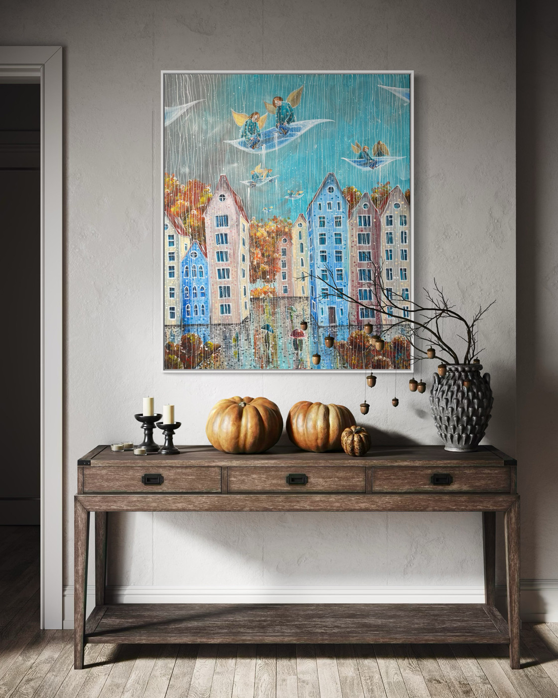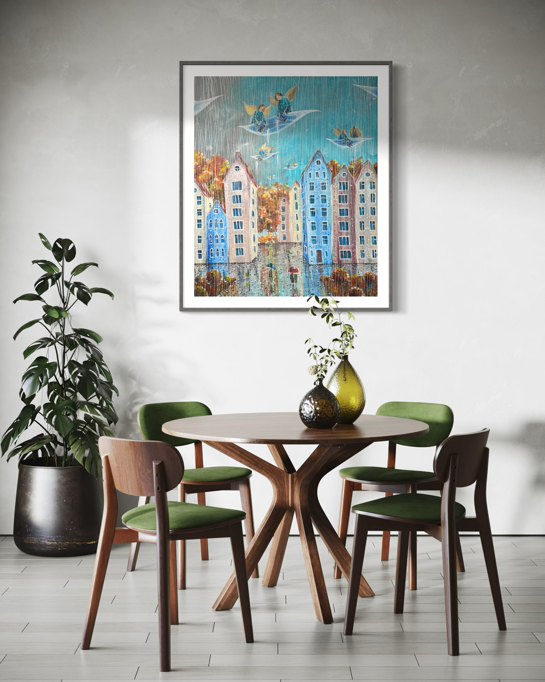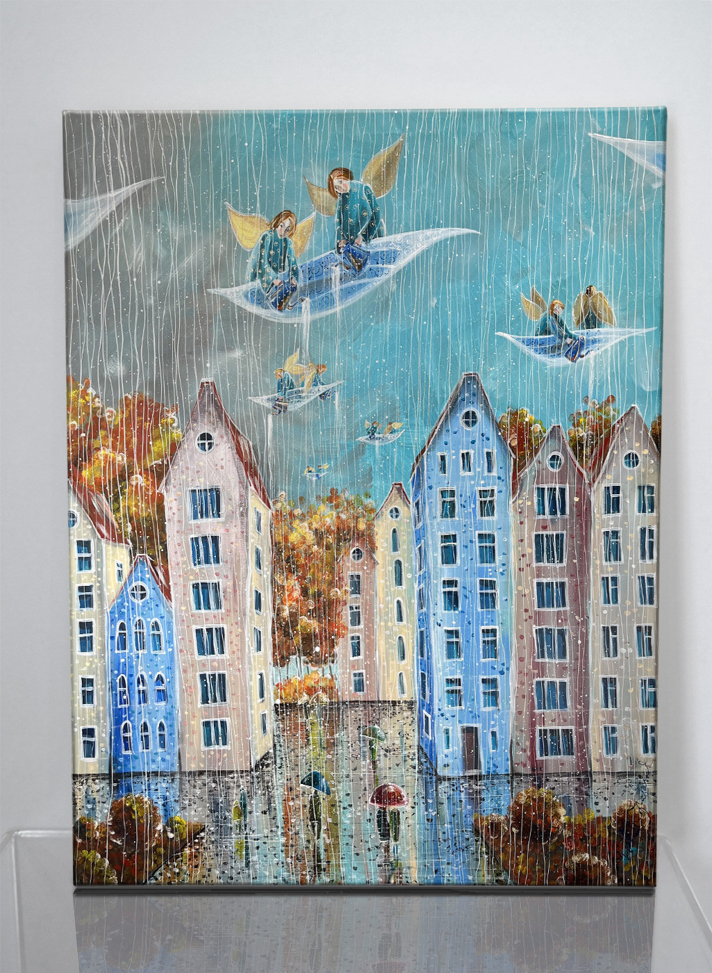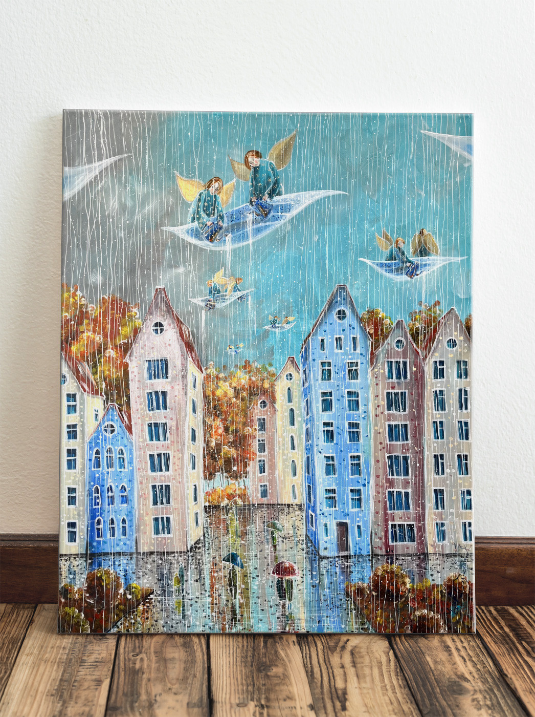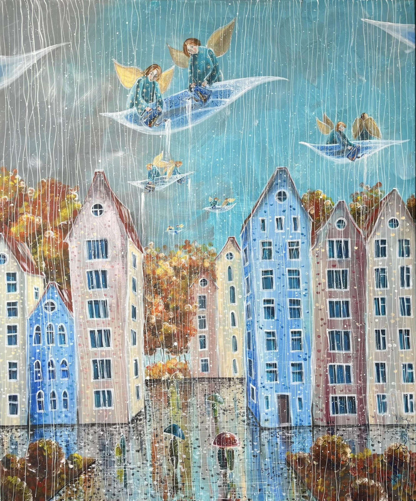 “Deszczowy dzień” to dzieło akrylowe na płótnie o wymiarach 100×120 cm z 2024 roku, które przenosi widza w serce miejskiego pejzażu ożywionego deszczem. Anioły, unoszące się nad kolorowymi kamienicami, wprowadzają element fantazji do codziennej sceny, tworząc kontrast pomiędzy rzeczywistością a marzeniami. Subtelna gra światła na mokrych powierzchniach i różnorodność kolorów kamienic sprawiają, że każdy element płótna opowiada własną historię, pozostawiając przestrzeń na indywidualne doznania i refleksje odbiorcy.