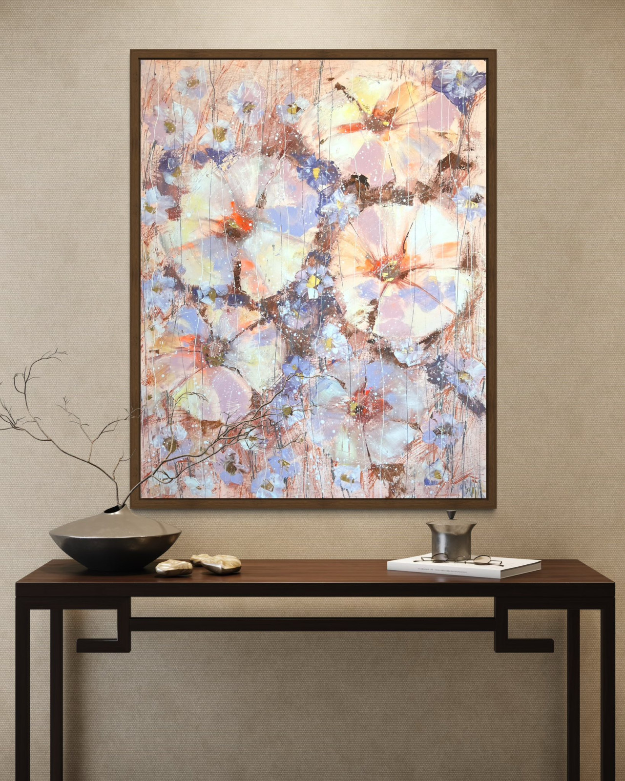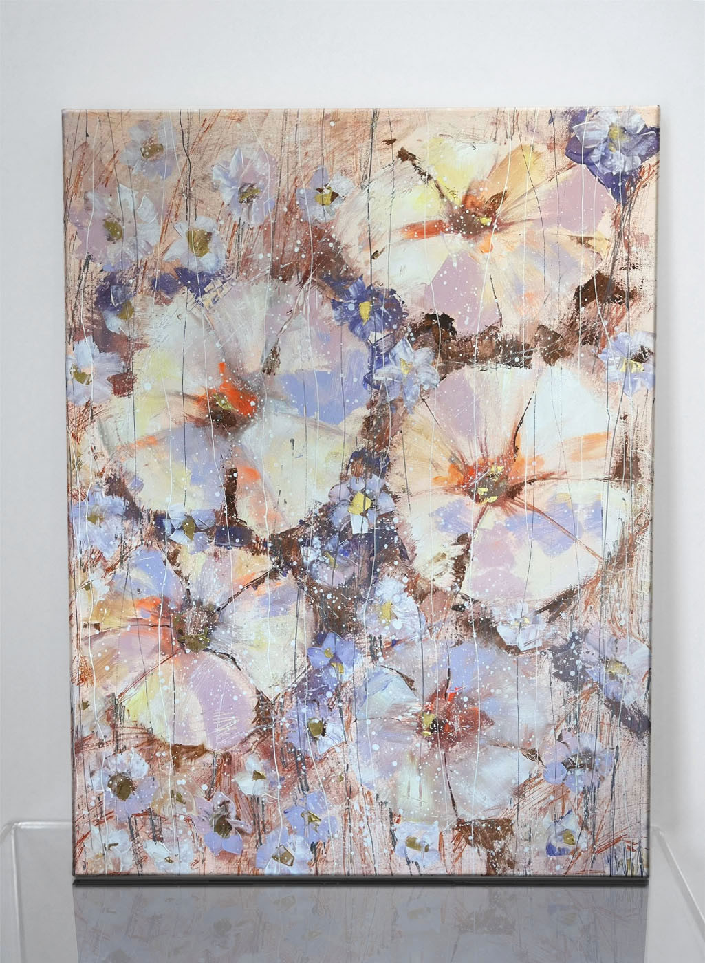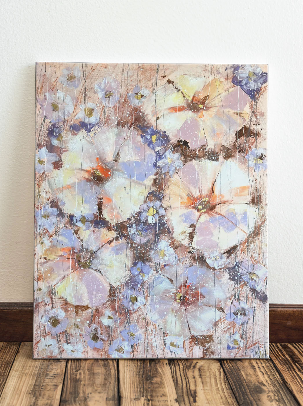 Autorski obraz, noszący tytuł „Flower kiss”. Malowany ręcznie farbami akrylowymi, a następnie wydrukowany na wysokiej jakości płótnie i naciągnięty na drewniane krosno. Do wykonania reprodukcji wykorzystana została drukarka do foto-wydruków SureColor SC-p9000 firmy EPSON, która doskonale i w pełni odwzorowuje barwy oraz ich przejścia tonalne przy użyciu bezwonnych i ekologicznych tuszy o wysokiej trwałości. Sprzedawany bez ramy boki obrazu są zadrukowane, dlatego jest on gotowy do powieszenia.