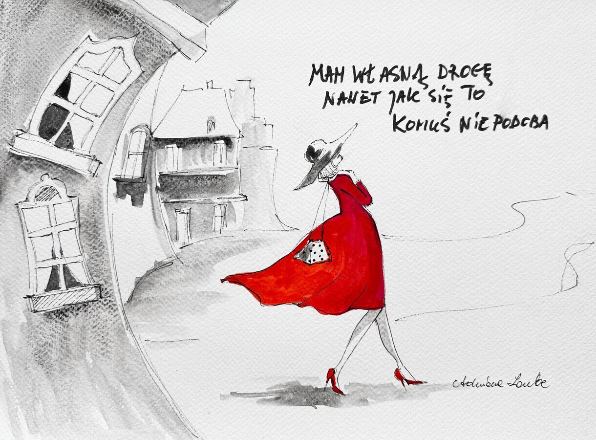 MAM WŁASNĄ DROGĘ - akwarela z dodatkiem piórka wykonana na białym 300g papierze A4 (29,7cm x 21cm).
