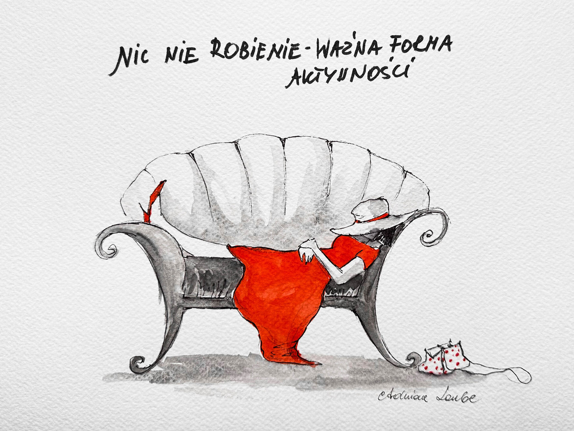 NIC-NIE-ROBIENIE - akwarela z dodatkiem piórka wykonana na białym 300g papierze A4 (29,7cm x 21cm) przez artystkę plastyka Adrianę Laube.