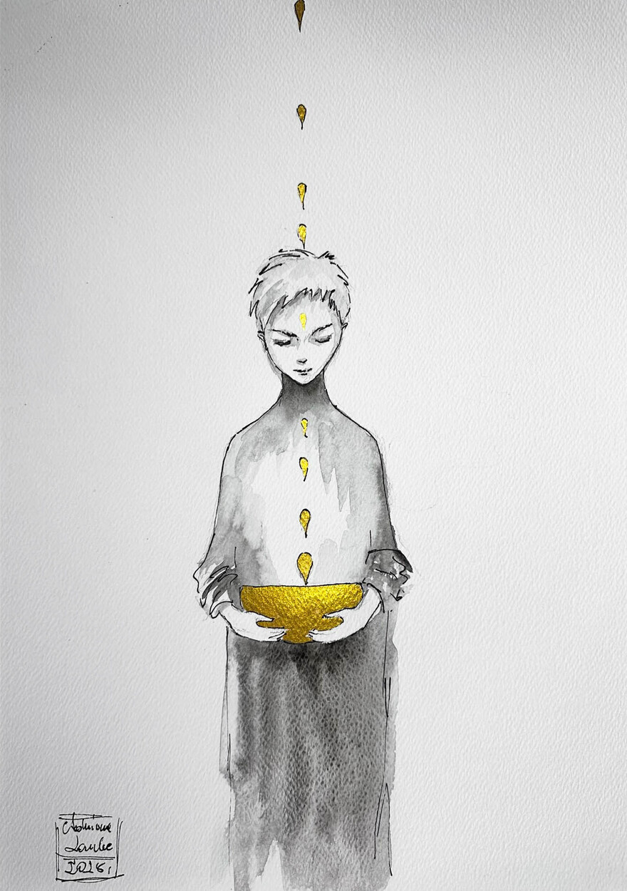 MEDYTACJA - akwarela z dodatkiem piórka oraz złotego tuszu wykonana na białym 300g papierze A3 (42cm x 30cm)