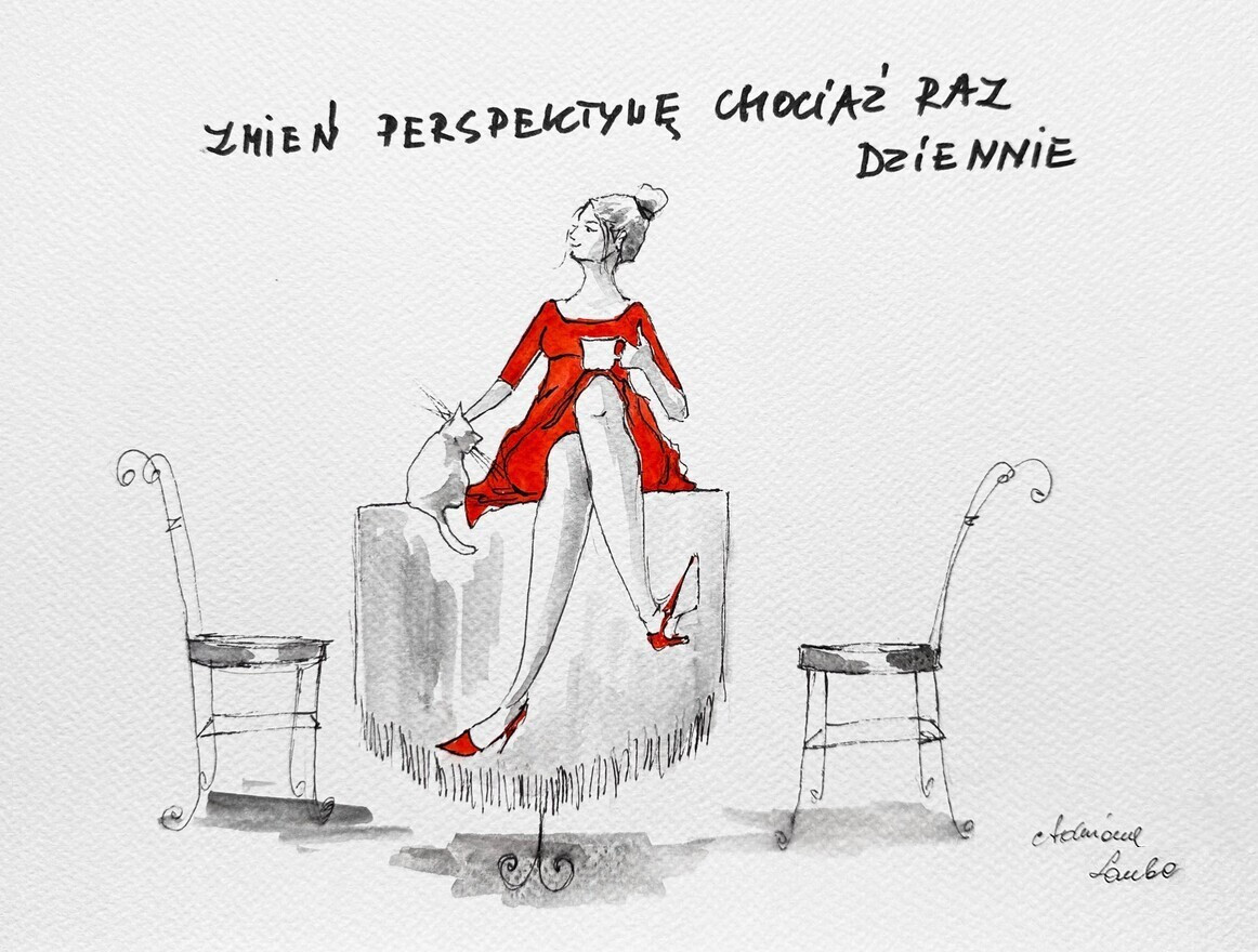 ZMIEŃ PERSPEKTYWĘ - akwarela z dodatkiem piórka wykonana na białym 300g papierze A4 (29,7cm x 21cm).