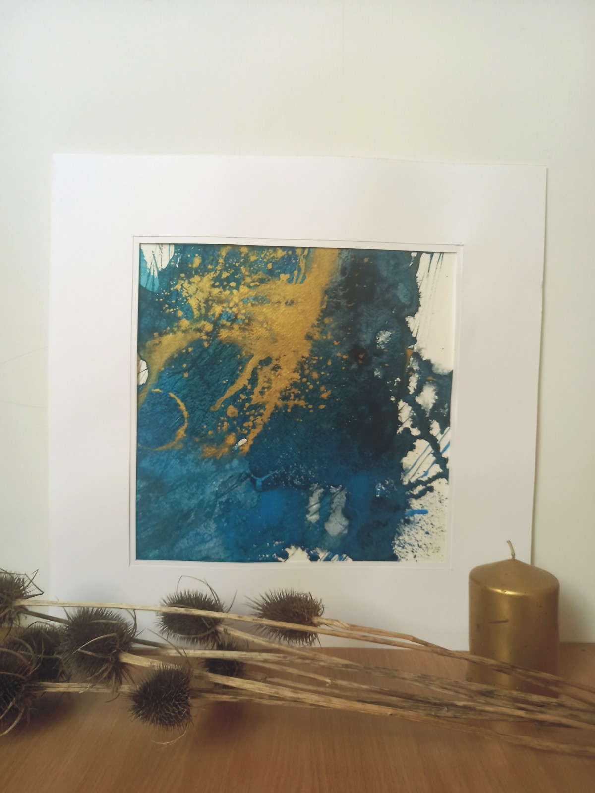 Akwarelowy abstrakcja w odcieniach niebieskiego plus złota farba. Malowana na dobrym papierze akwarelowy wysokiej jakości farbami. Może być inspiracją dla każdego i ciekawym elementem wnętrza. Obraz o wymiarach 30x30 cm. Pojedyńczy egzemplarz autorski sygnowany podpisem.