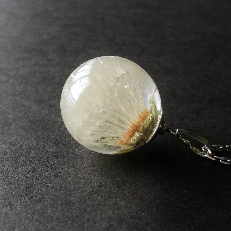 Ten mały wisiorek został wykonany z bezbarwnej, przezroczystej żywicy jubilerskiej, w której zatopiony został dmuchawiec.