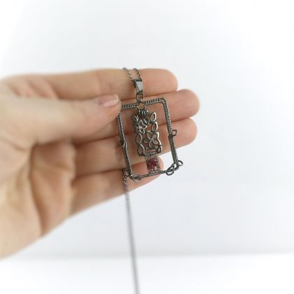 Wszystkie elementy metalowe w wisiorku zrobione są z oksydowanego (przyciemnionego) SREBRA 925 lub 999 (próba 999 to najwyższa próba srebra stosowana do wyrobu biżuterii).