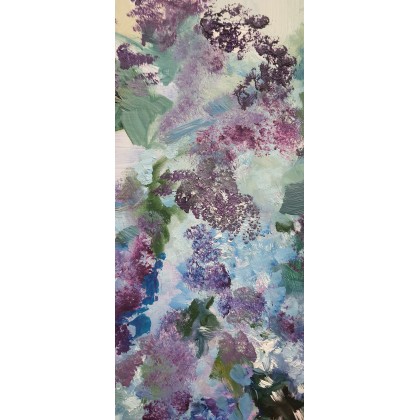Obraz w tonacji niebieskiej z fioletami, grube impasty farby kontrastują z rysunkowymi przedrapaniami, podkreślając wybrane obszary obrazu.