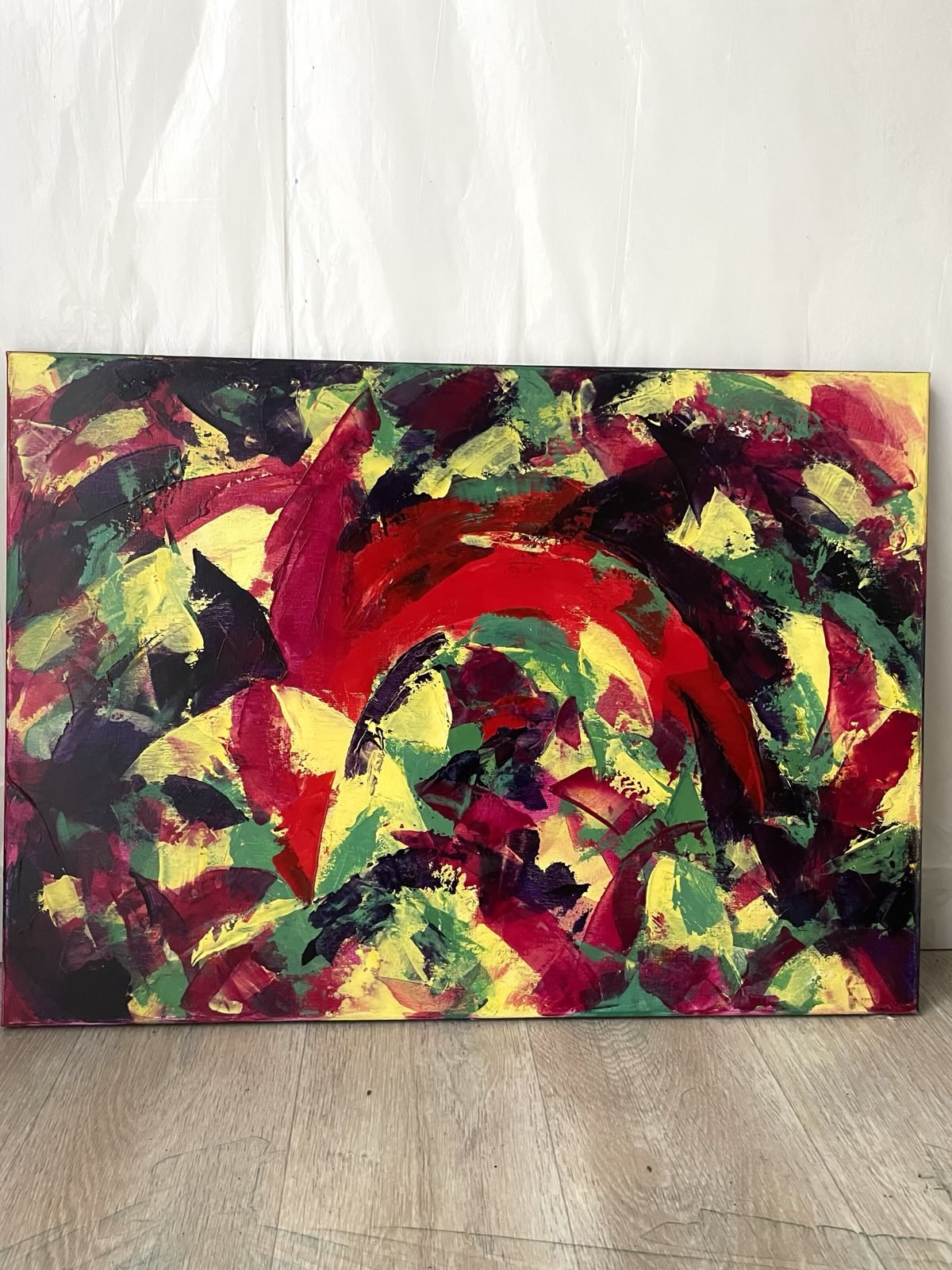 Praca powstała jako zapis akumulacji emocji — warstwowo, poprzez kolejne gesty, nawarstwianie koloru i energii.