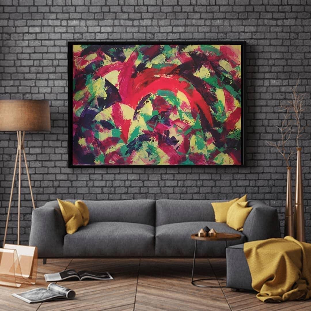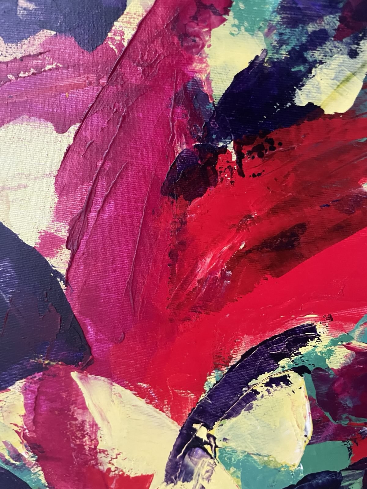 Abstrakcyjny, ekspresyjny obraz oparty na napięciu między czerwienią, fioletem i akcentami żółci.