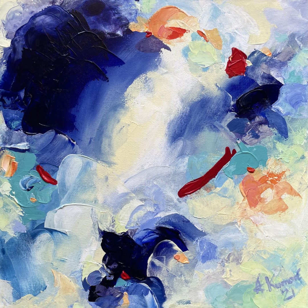 Obraz abstrakcyjny na płótnie bawełnianym naciągniętym na blejtram, 30 x 30 cm, techniki mieszane, pokryty bezbarwnym werniksem, boki są zamalowane, nie wymaga i nie posiada oprawy, posiada zawieszkę.