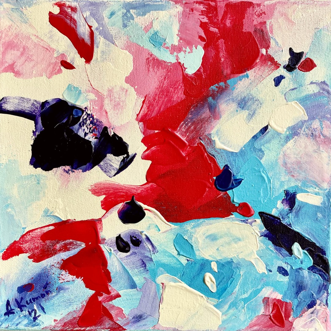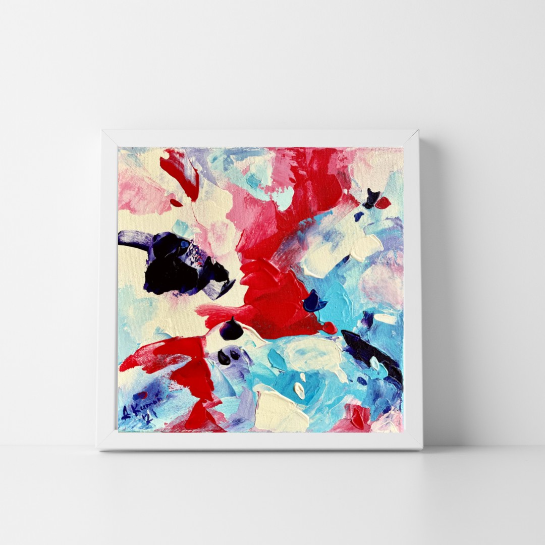 Obraz abstrakcyjny na płótnie bawełnianym naciągniętym na blejtram, 20 x 20 cm, techniki mieszane, pokryty bezbarwnym werniksem, boki są zamalowane, nie wymaga i nie posiada oprawy, posiada zawieszkę.