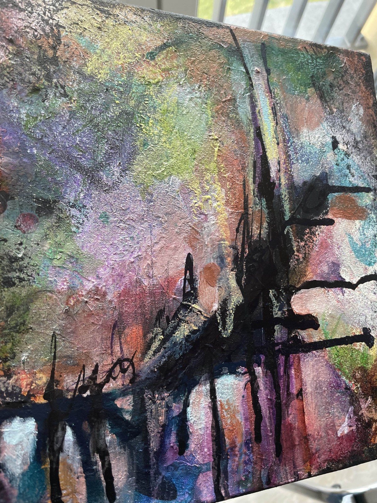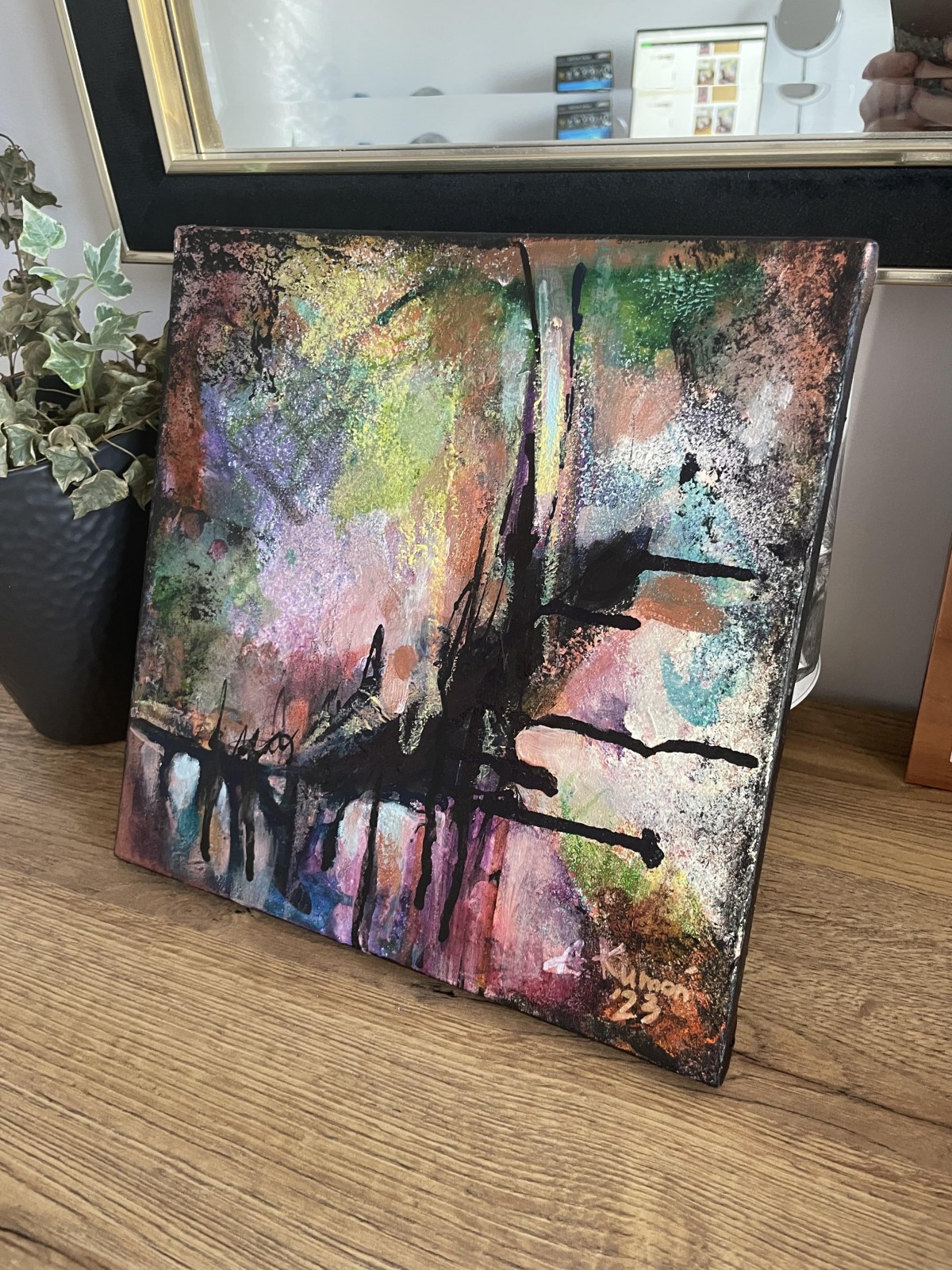 Obraz abstrakcyjny na płótnie bawełnianym naciągniętym na blejtram, 25 x 25 cm, techniki mieszane, pokryty bezbarwnym werniksem, boki są zamalowane na granatowo, nie wymaga oprawy, posiada dwie zawieszki.