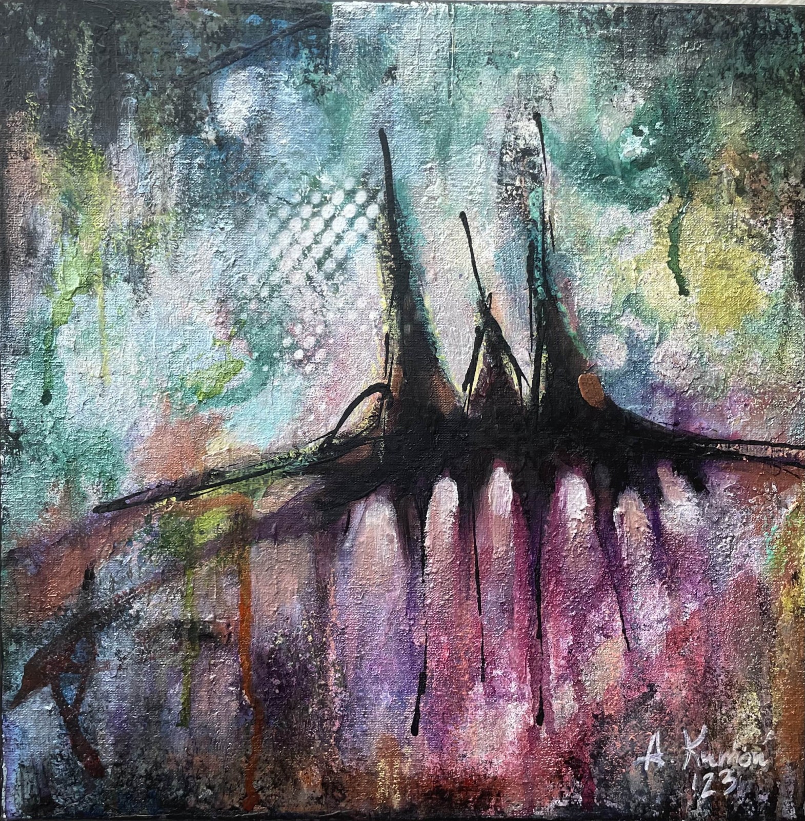 Obraz abstrakcyjny na płótnie bawełnianym naciągniętym na blejtram, 30 x 30 cm, techniki mieszane, pokryty bezbarwnym werniksem, boki są zamalowane na granatowo, nie wymaga oprawy, posiada dwie zawieszki.