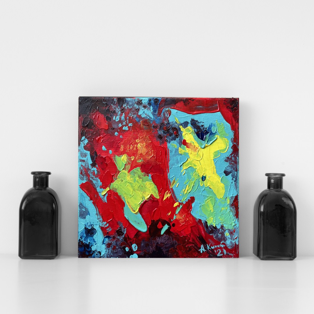 Obraz abstrakcyjny na płótnie bawełnianym naciągniętym na blejtram, 20 x 20 cm, techniki mieszane, pokryty bezbarwnym werniksem, boki są zamalowane, nie wymaga i nie posiada oprawy, posiada zawieszkę.