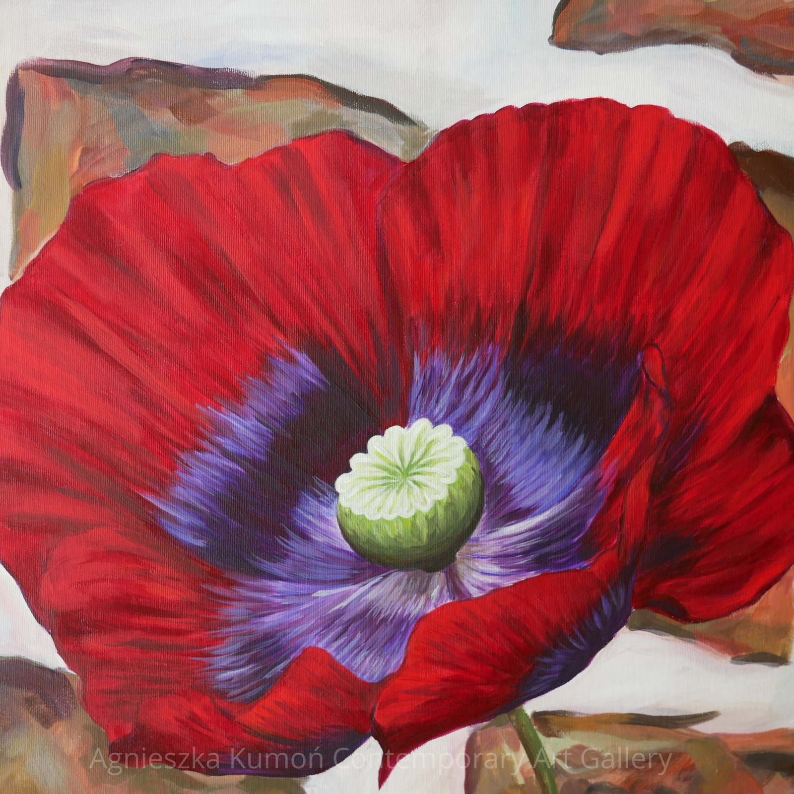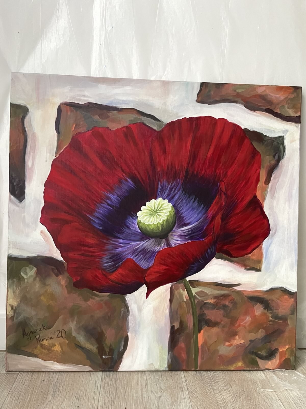 Soczysta czerwień kwiatu zestawiona z surowym tłem cegły — kontrast, który podbija energię i światło - to moment radości zatrzymany na płótnie.