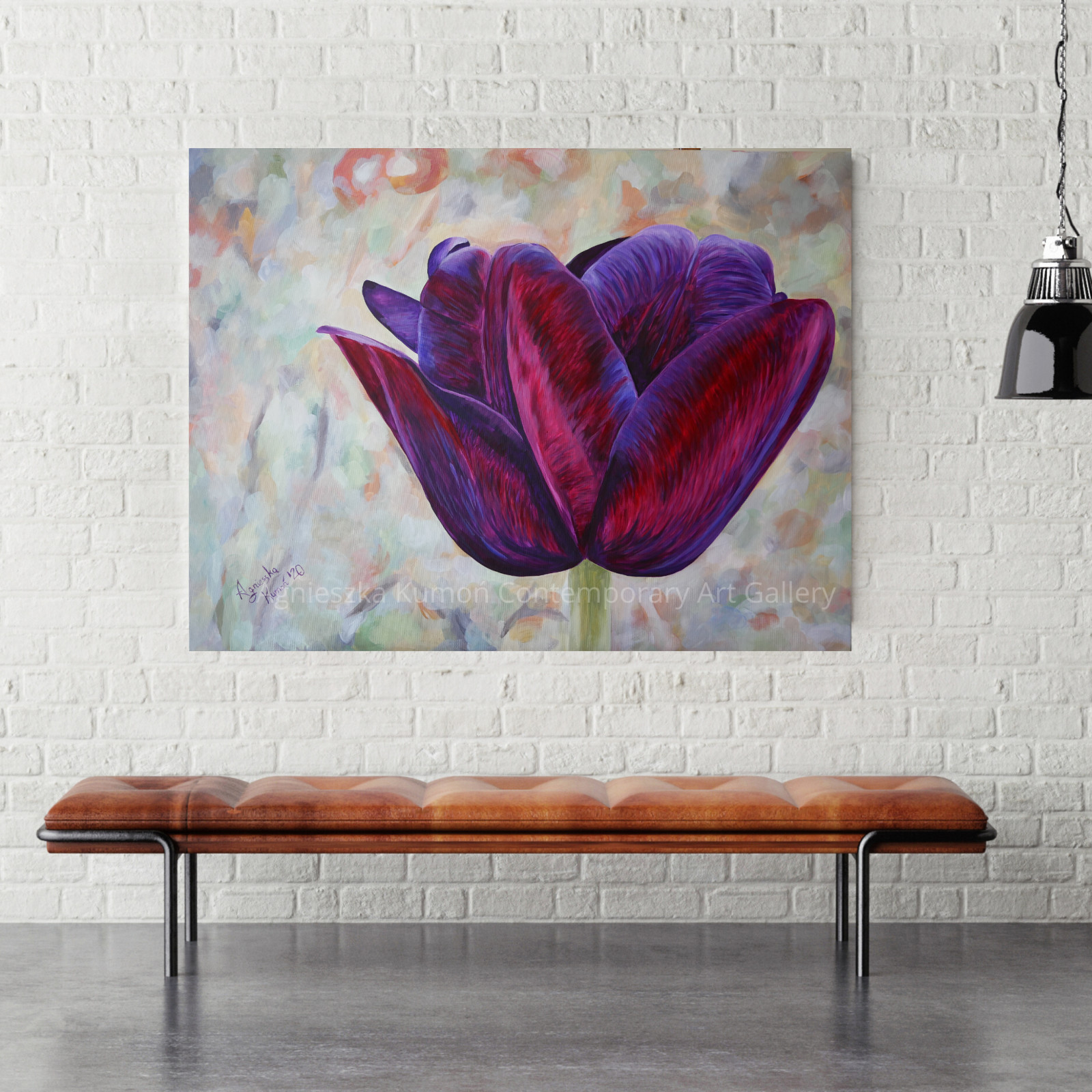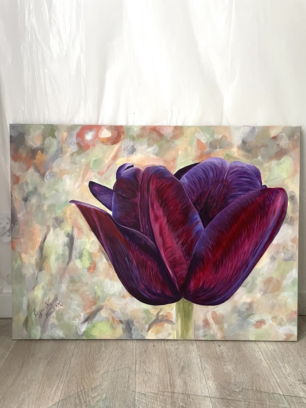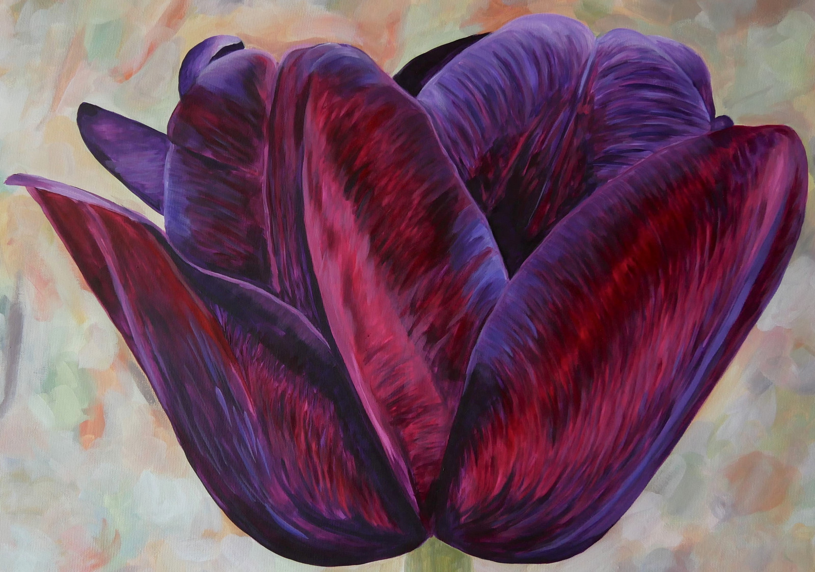 Malowałam go z zachwytu nad kolorem i powierzchnią płatków: głęboki bordowy, wpadający w fiolet, z tym charakterystycznym połyskiem, który tulipany mają tylko w ostrym świetle.