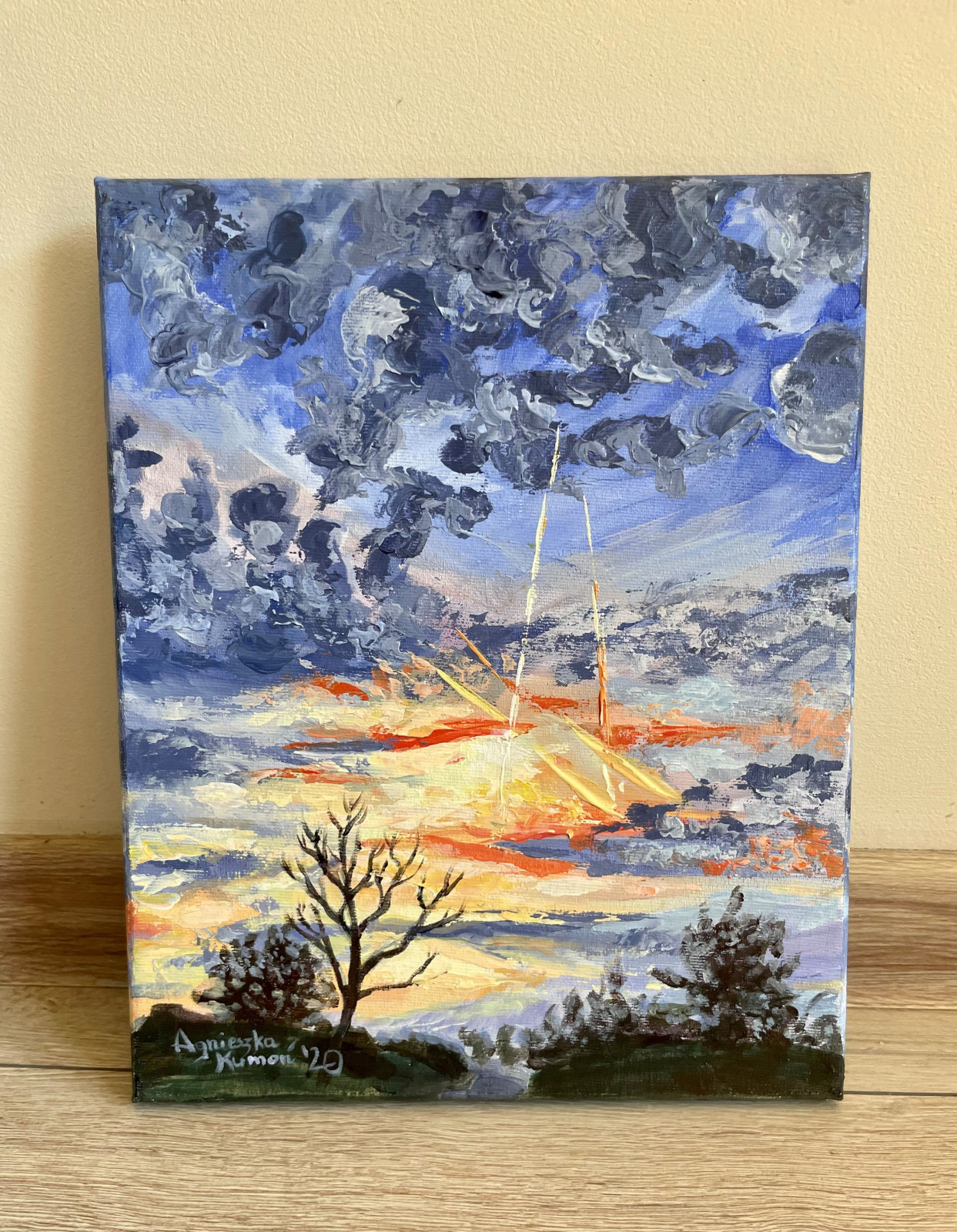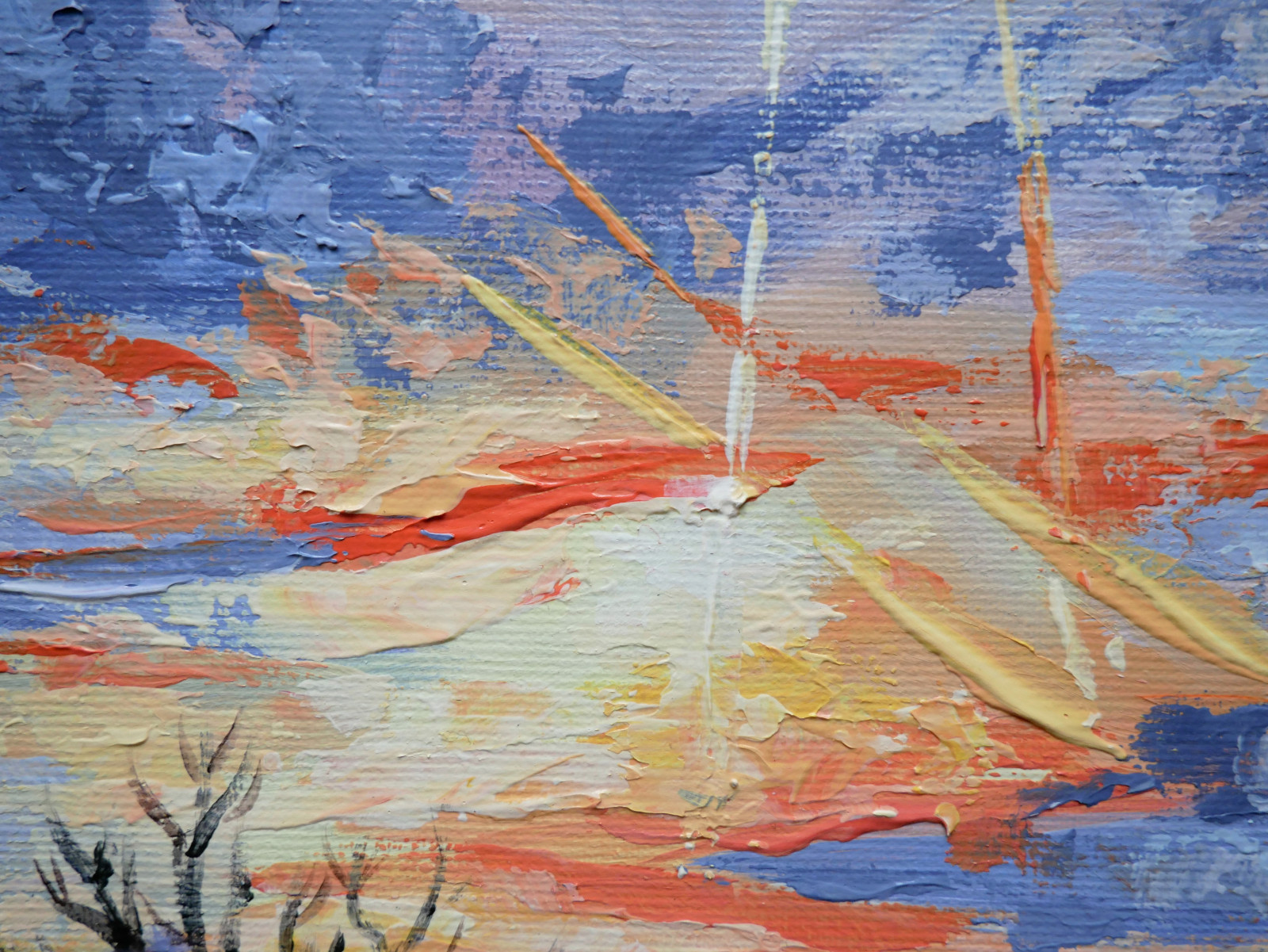 Zatrzymany zachód słońca na płótnie, wraz z fakturą chmur i promieni.