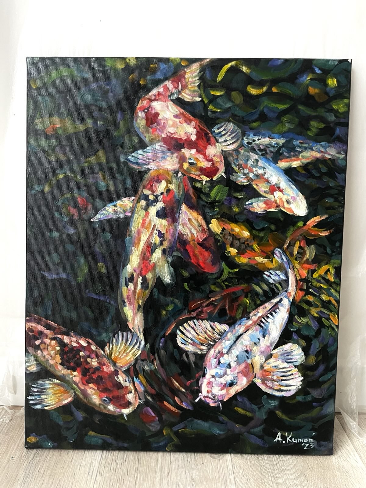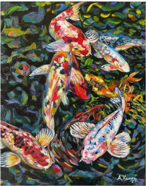 Mimo organicznego, wodnego tematu praca ma w sobie ciszę i elegancję — kolory ryb delikatnie błyszczą, jakby były zawieszone pod taflą.