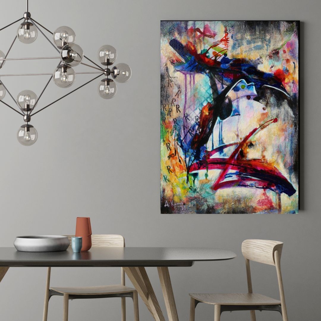 Obraz abstrakcyjny na płótnie bawełnianym naciągniętym na blejtram, 50 x 70 cm, techniki mieszane, pokryty bezbarwnym werniksem, boki są zamalowane na granatowo, nie wymaga oprawy, posiada dwie zawieszki.
