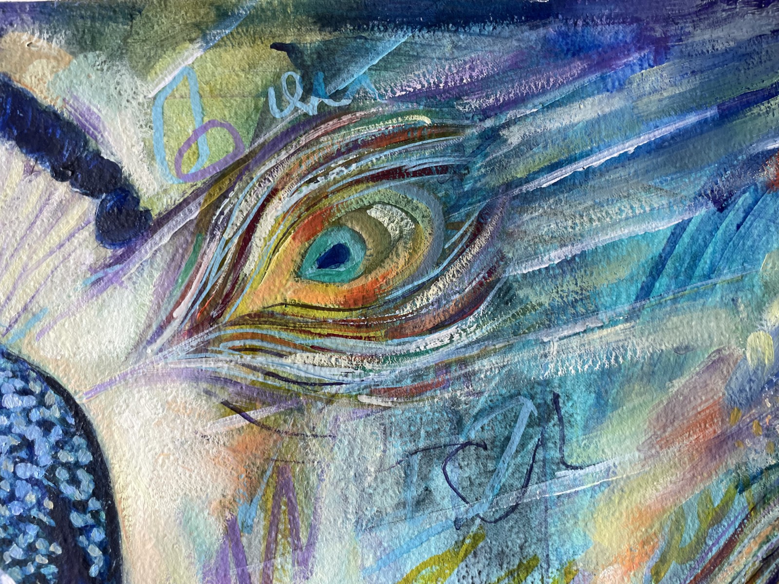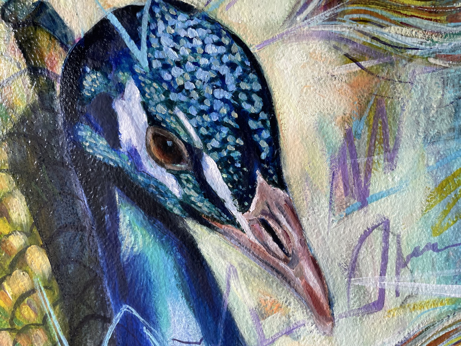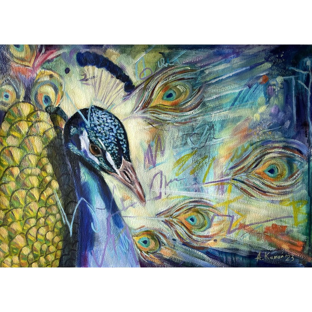 Obraz Peacock , techniki mieszane akryl + olej na papierze wysokiej jakości, canson 100% bawełna, 300g. 56x76 cm bez oprawy, 80x60 cm z oprawą z passe-partout.