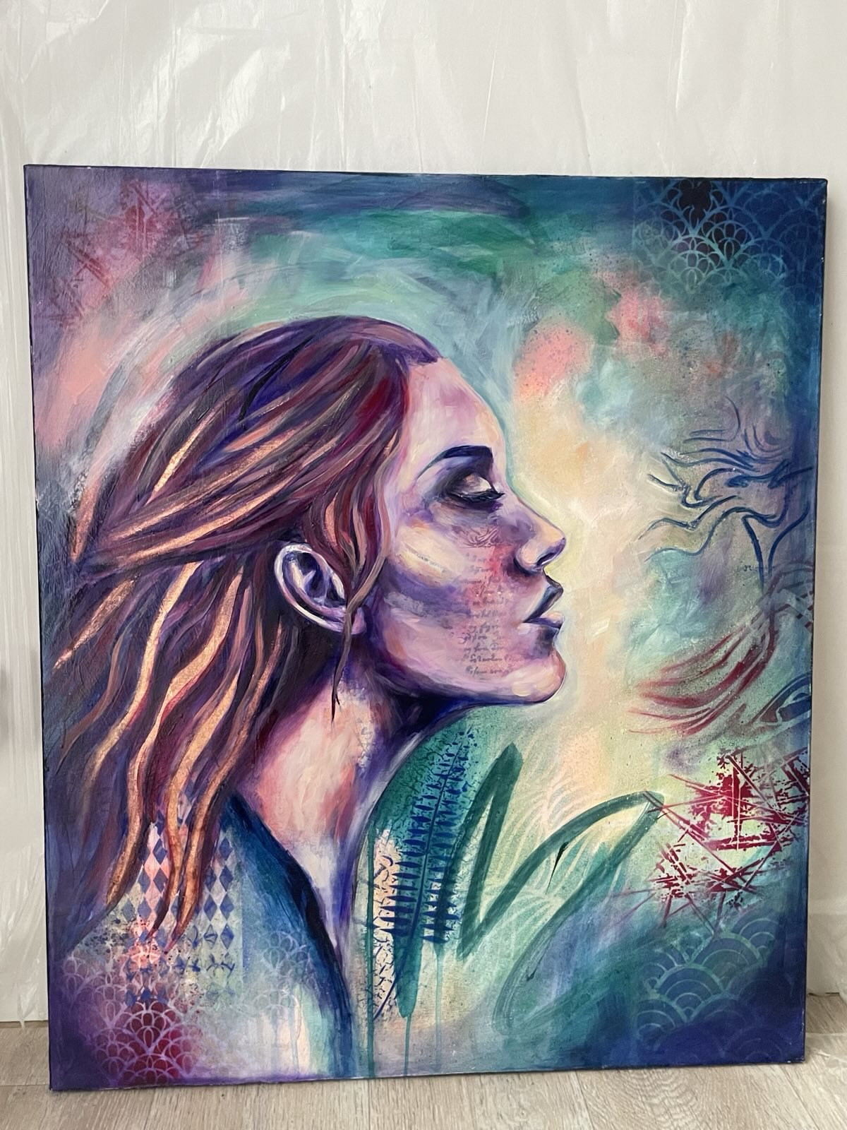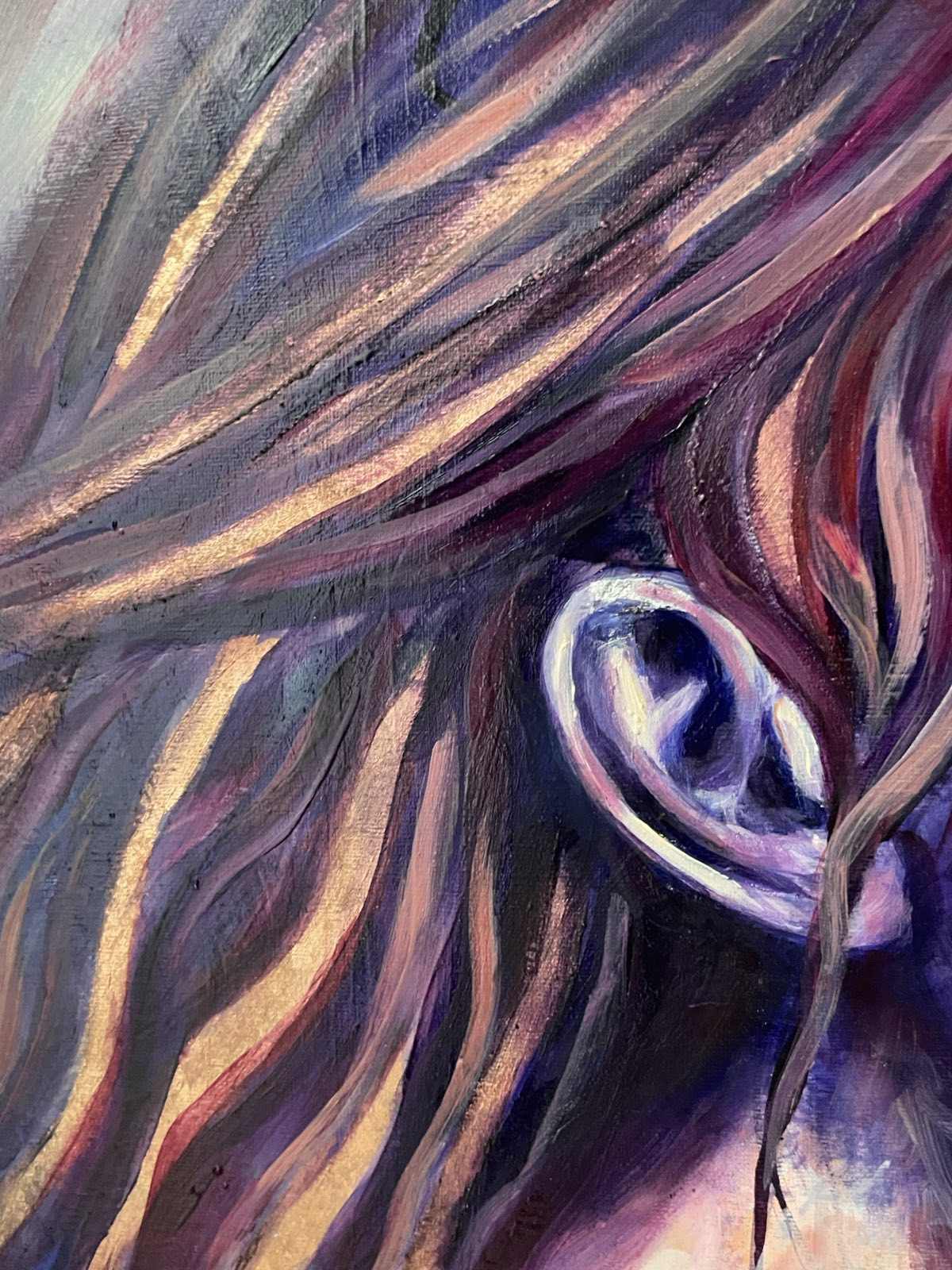 Technika: akryl, spray, tusz, miedziany szlagmetal, olej na płótnie