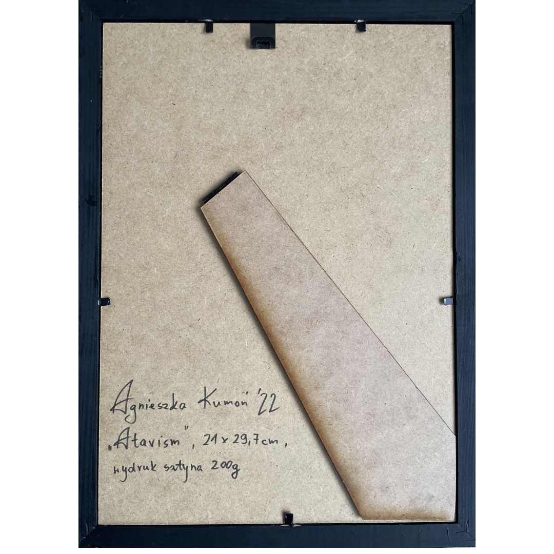 Wydruk obrazu Atavism w formacie A4 ? 29,7 cm x 21,0 cm plus ramka. Papier satyna 200 g. Ramka posiada zawieszkę i nóżkę, wydruk może być zarówno powieszony, jak i postawiony. Ramka drewniana, własnoręcznie malowana i lakierowana.