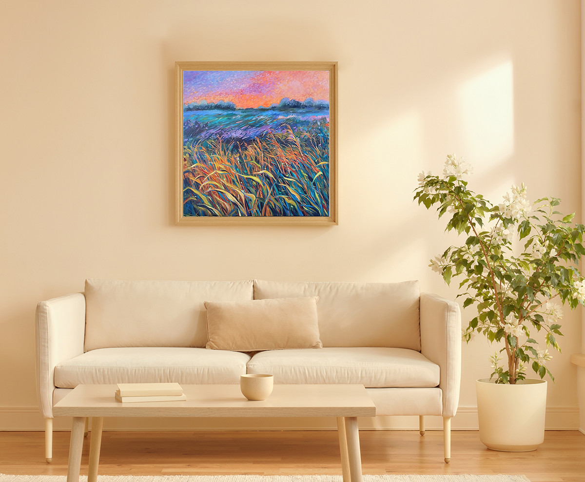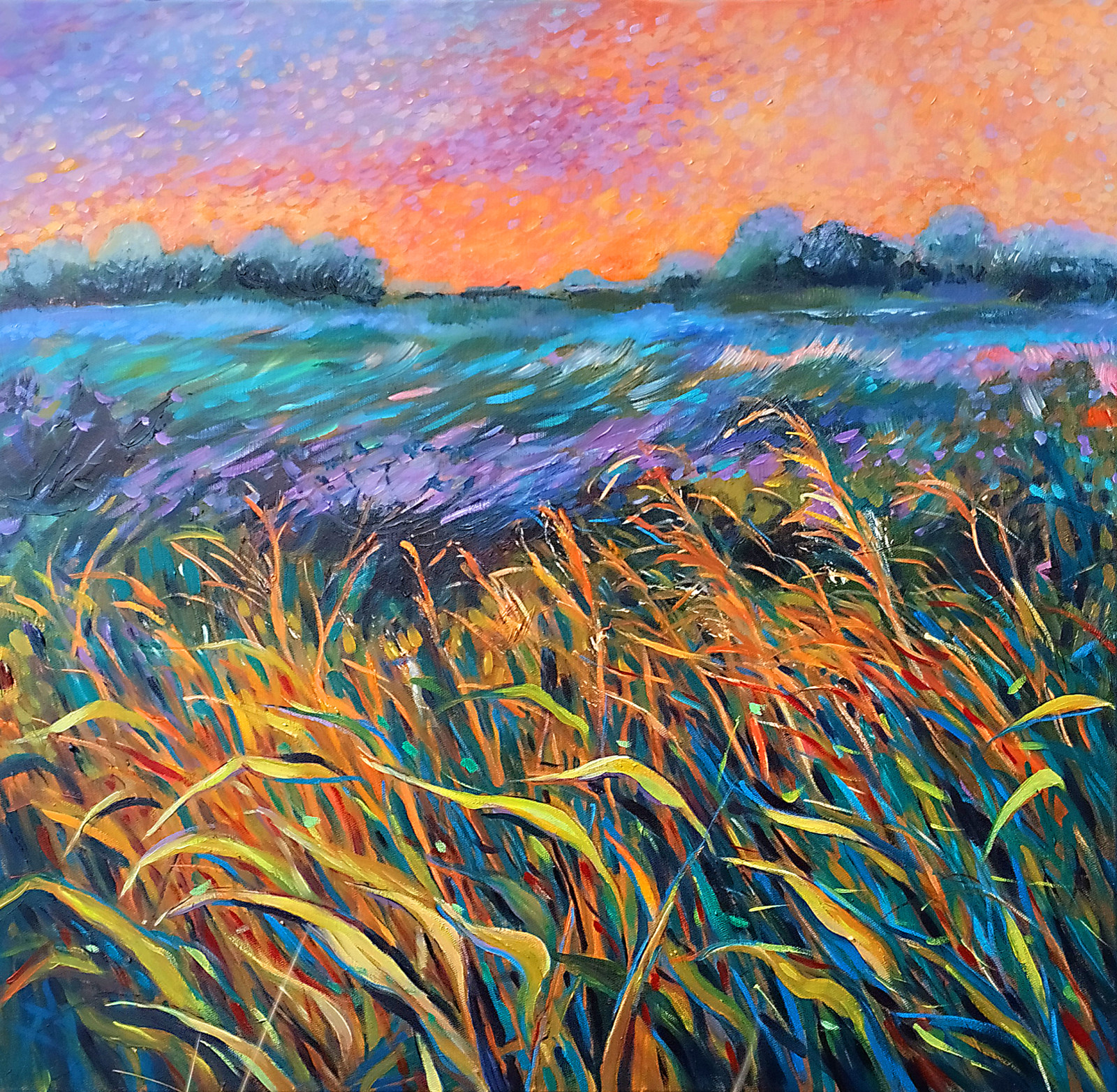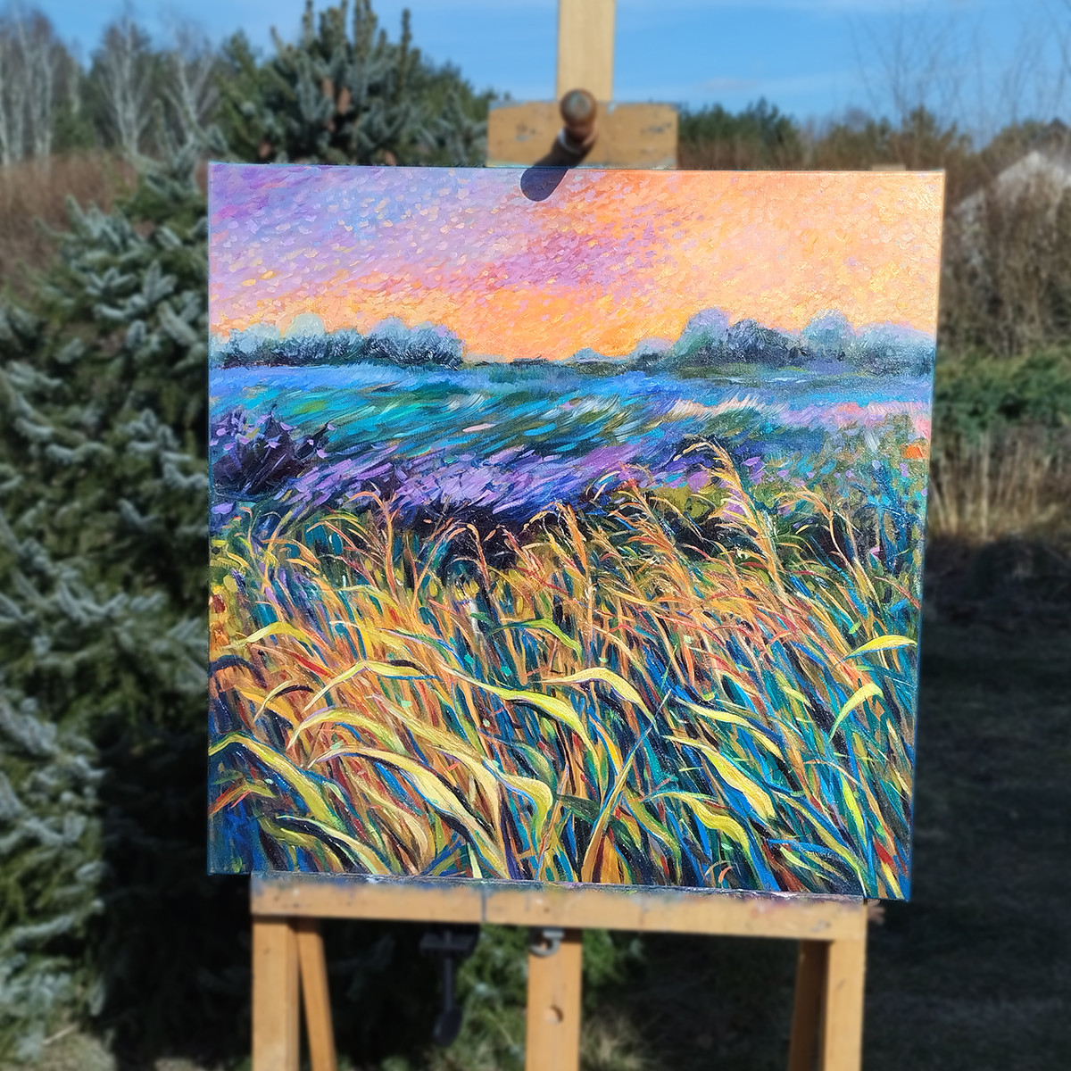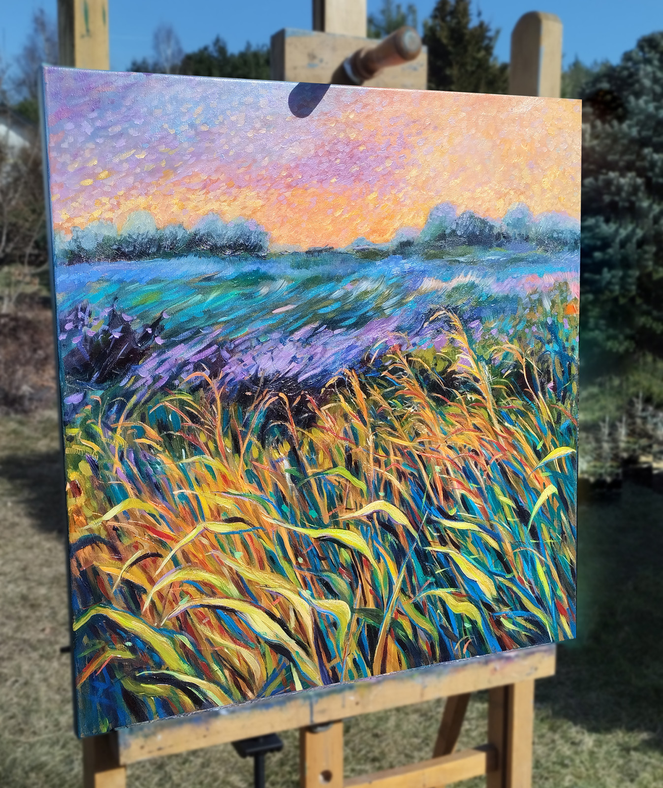 Olej na płótnie o wymiarach 60x60 cm. Obraz ma zamalowane boki i jest zabezpieczony werniksem damarowym satynowym.