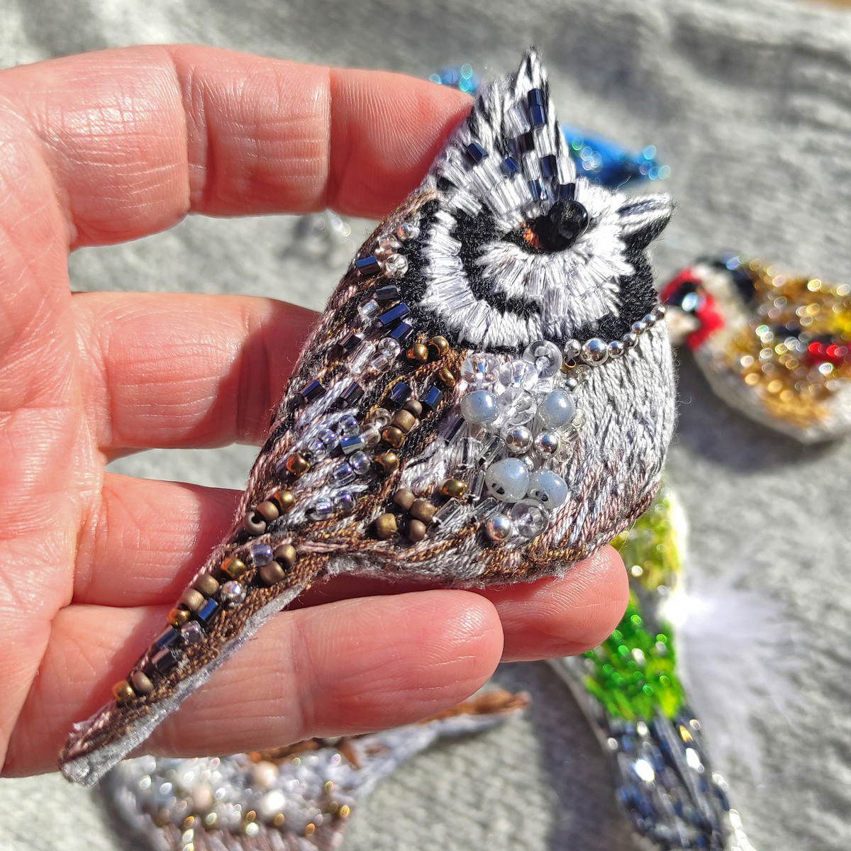 Piękna ręcznie wykonana broszka sikorki czubatki w pełni haftowana z dodatkiem szklanych koralików.