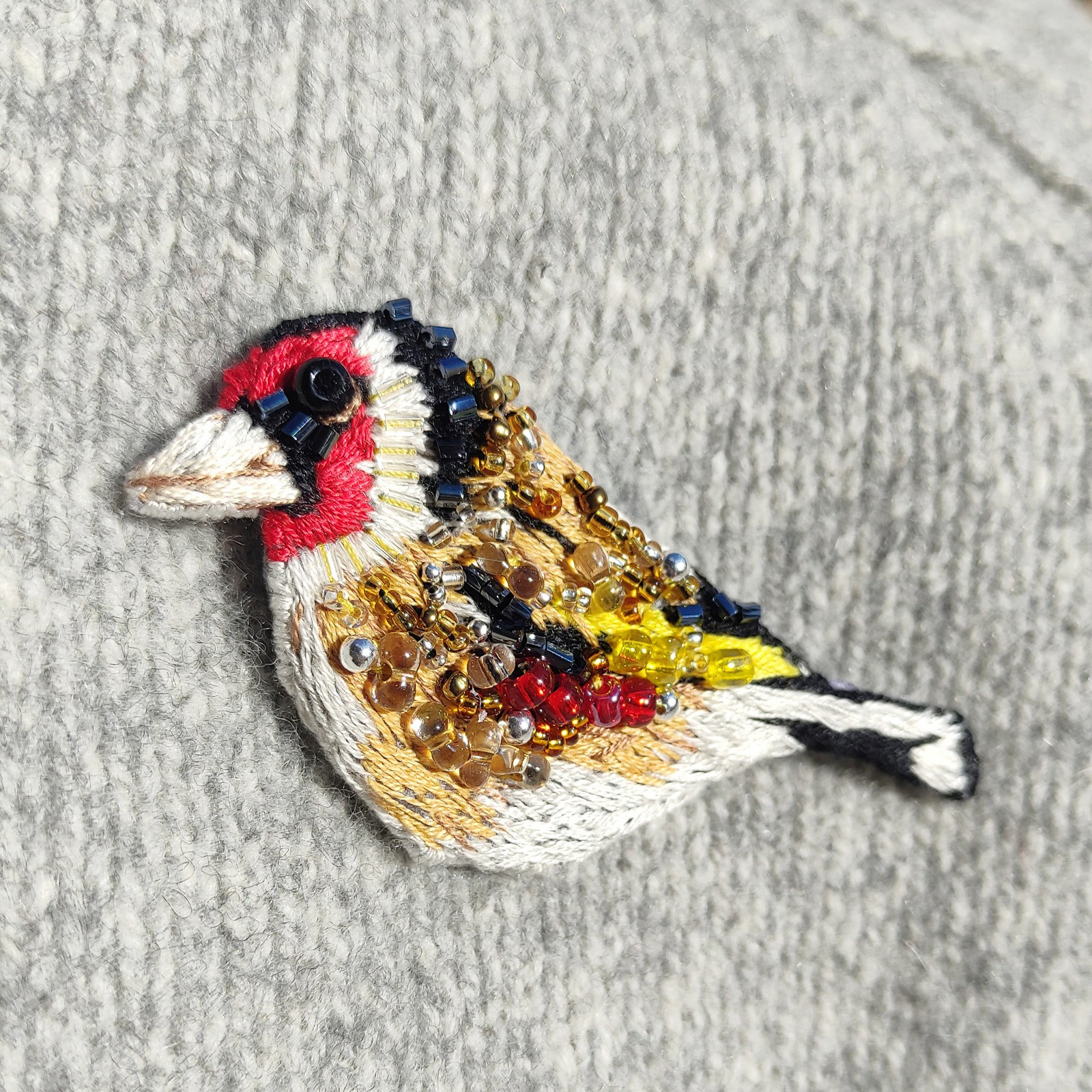 Piękna ręcznie wykonana broszka szczygła w pełni haftowana z dodatkiem szklanych koralików.