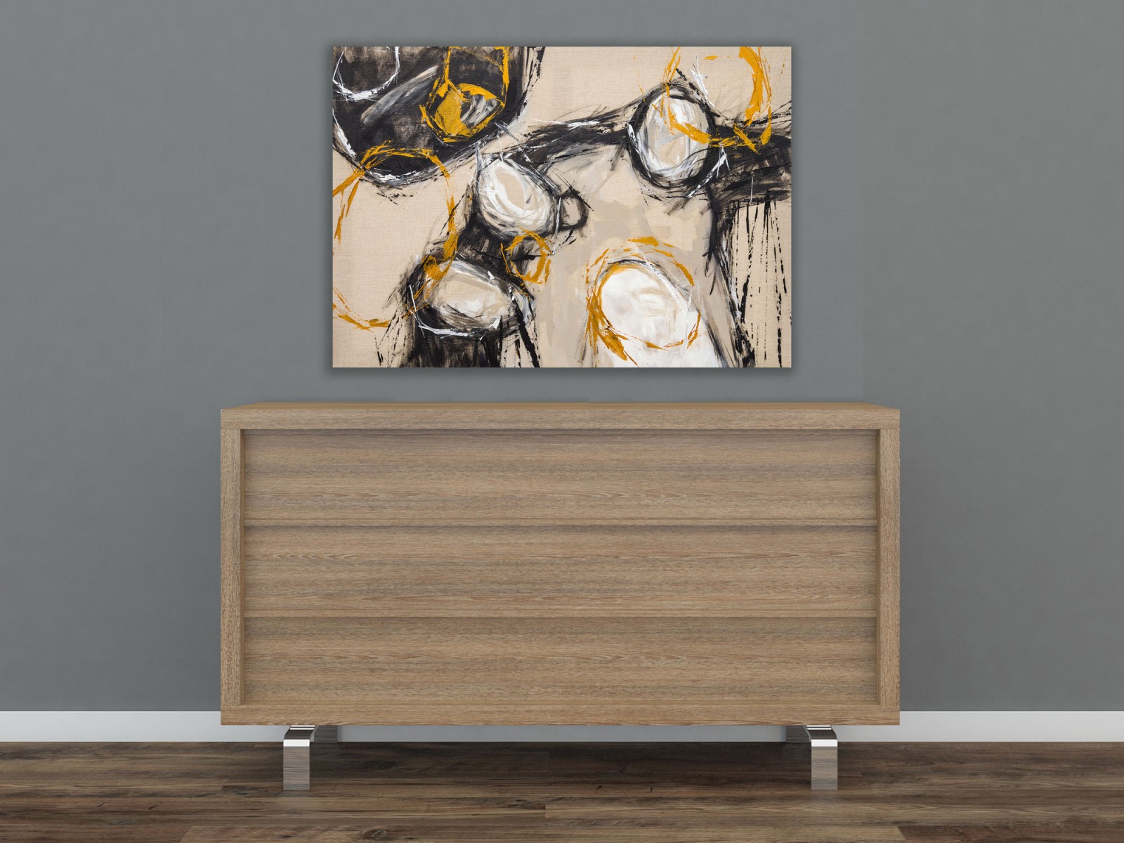 Nowoczesny ekspresyjny i abstrakcyjny obraz wykonany technice akrylowej na surowym płótnie lnianym zatytułowany ?Wahadło?.
