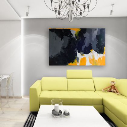 Abstrakcyjny ręcznie malowany obraz, na płótnie bawełnianym, w formacie 150x100 cm w układzie poziomym.