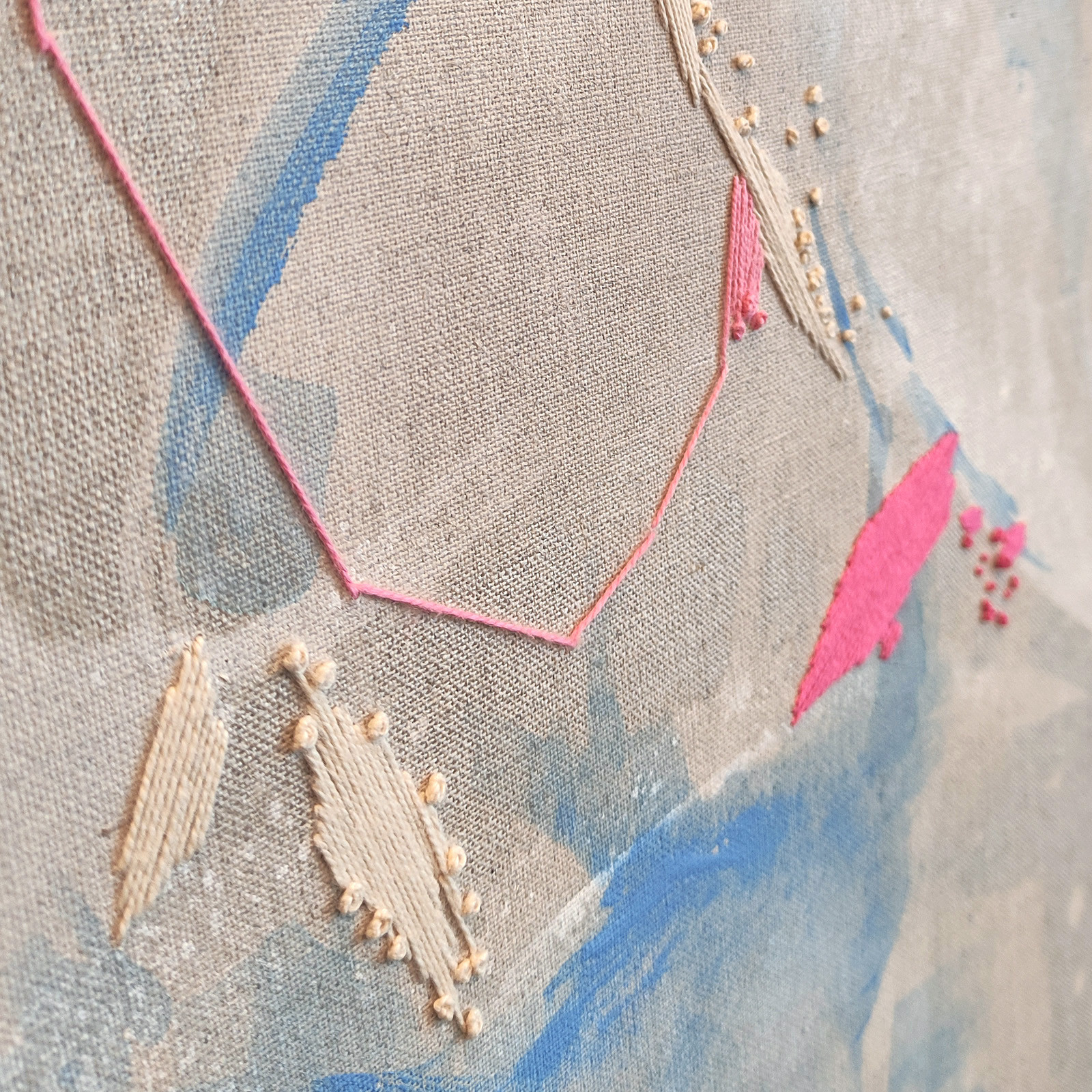 Nowoczesny abstrakcyjny i niezwykle delikatny obraz wykonany technice haftu połączonej z malarstwem, na surowym płótnie lnianym zatytułowany Elektryczny księżyc.