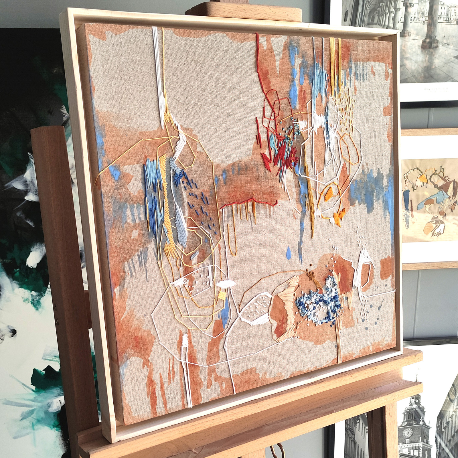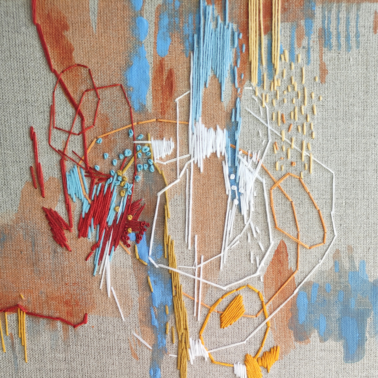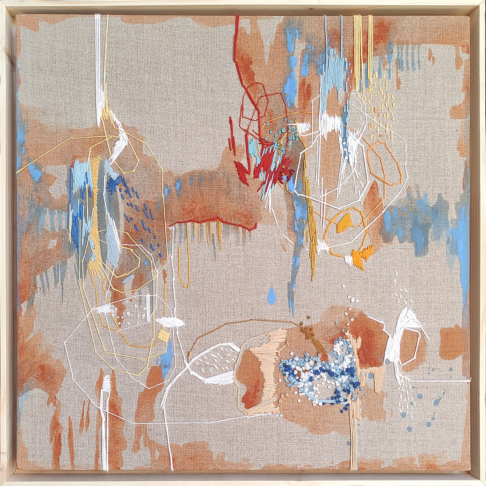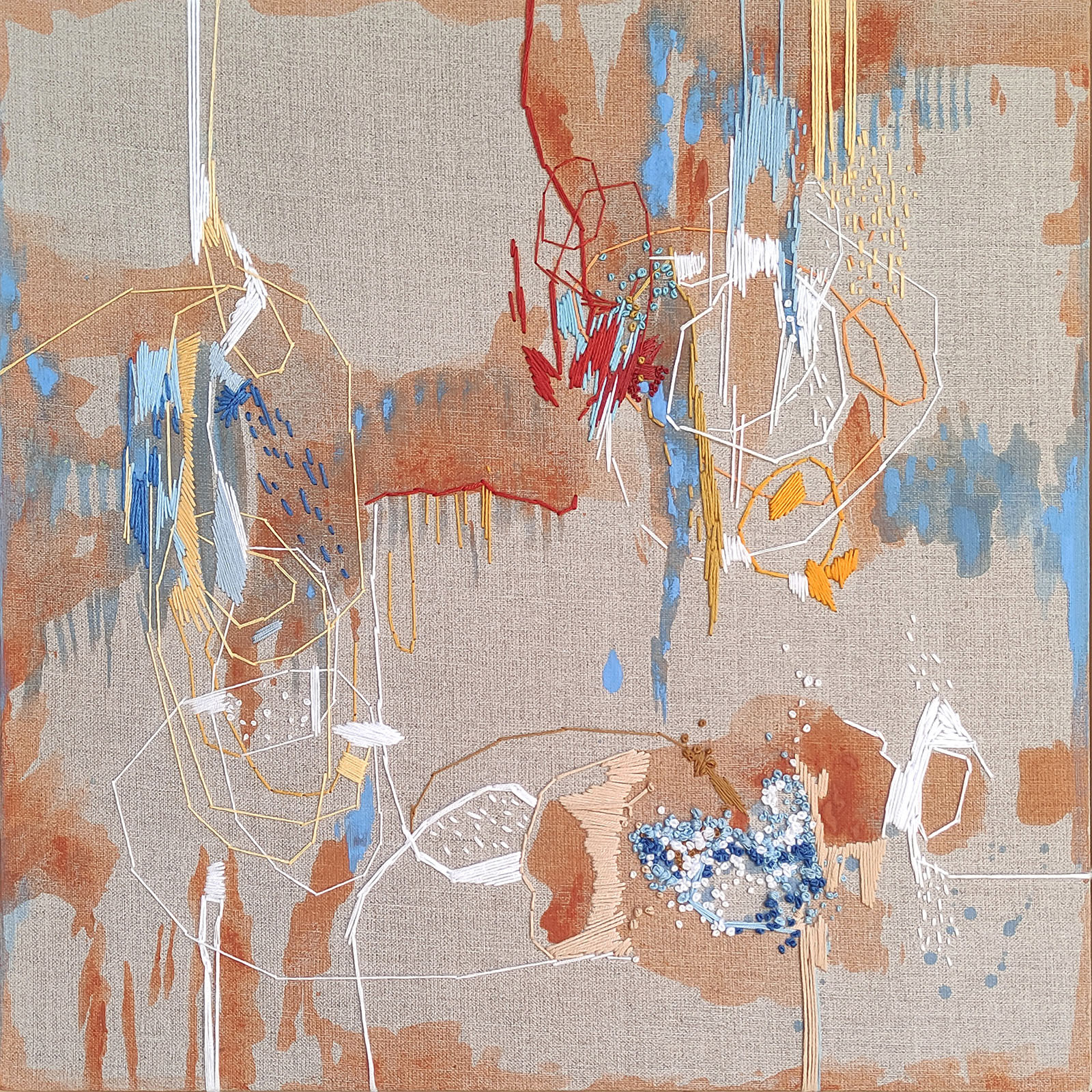 Nowoczesny abstrakcyjny obraz wykonany technice akrylowej w połączeniu z haftem na surowym płótnie lnianym zatytułowany „Sielanka”. Format obrazu 40×40 cm i głębokości podobrazia 2 cm.