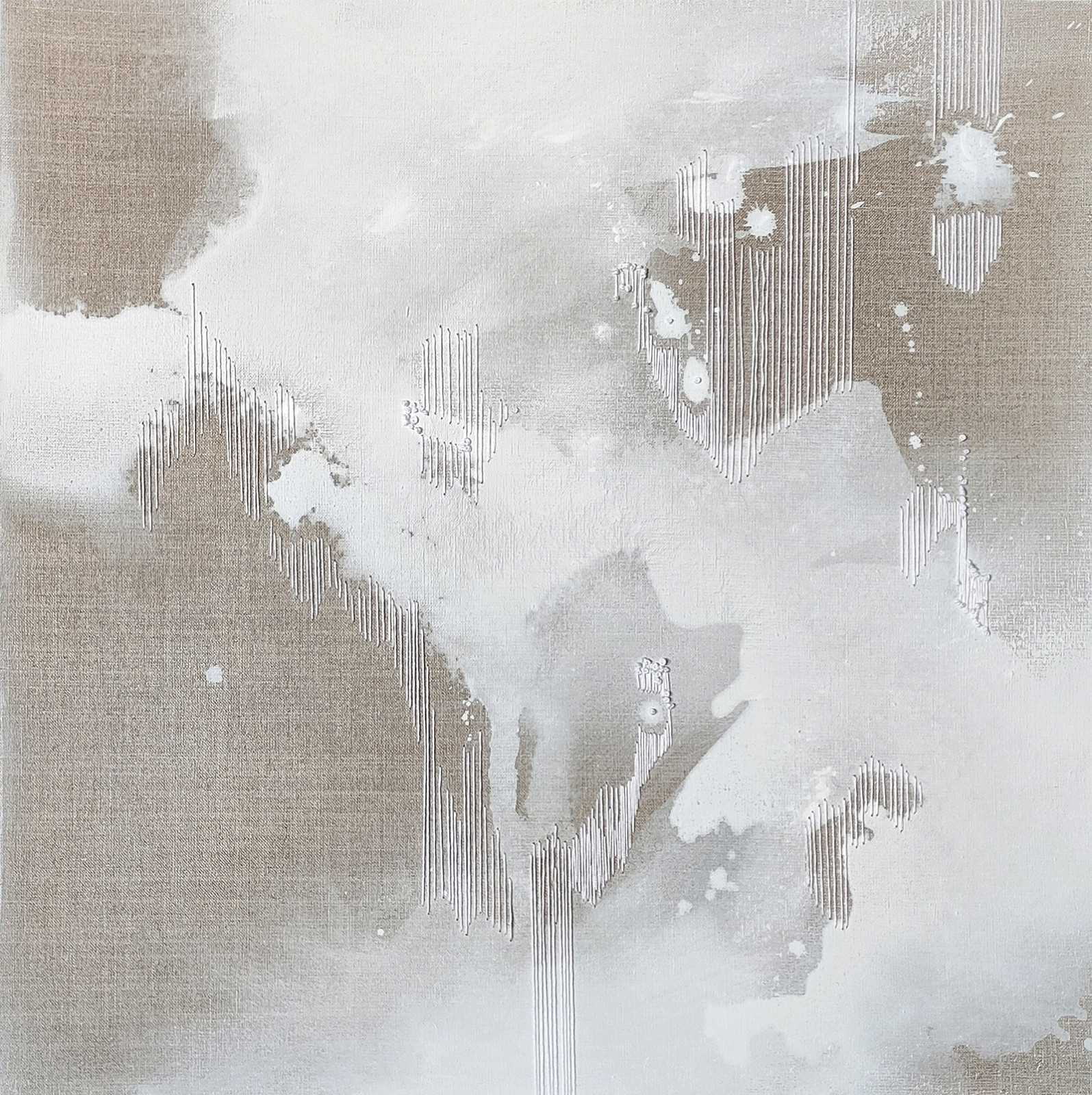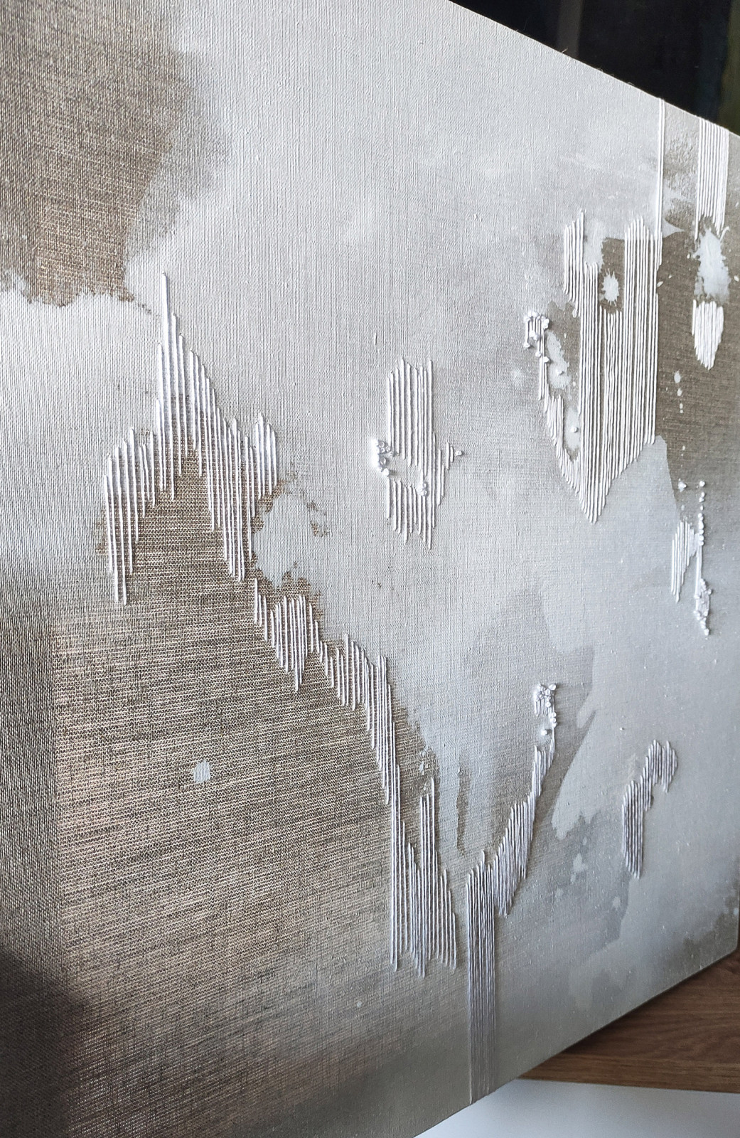 Nowoczesny abstrakcyjny i niezwykle delikatny obraz wykonany technice haftu połączonej z malarstwem, na surowym płótnie lnianym zatytułowany „Ulotnie I”.