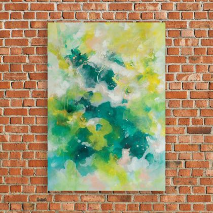 Obraz utrzymany jest w zieleni, koloru żółtego, butelkowej/szmaragdowej zieleni, jasnego różu, bieli. Technika wzorcowego to akryl, którego powierzchnia była lekko fakturowana, co widoczne jest również na wydruku na płótnie, do złudzenia przypominający obraz malowany ręcznie.
