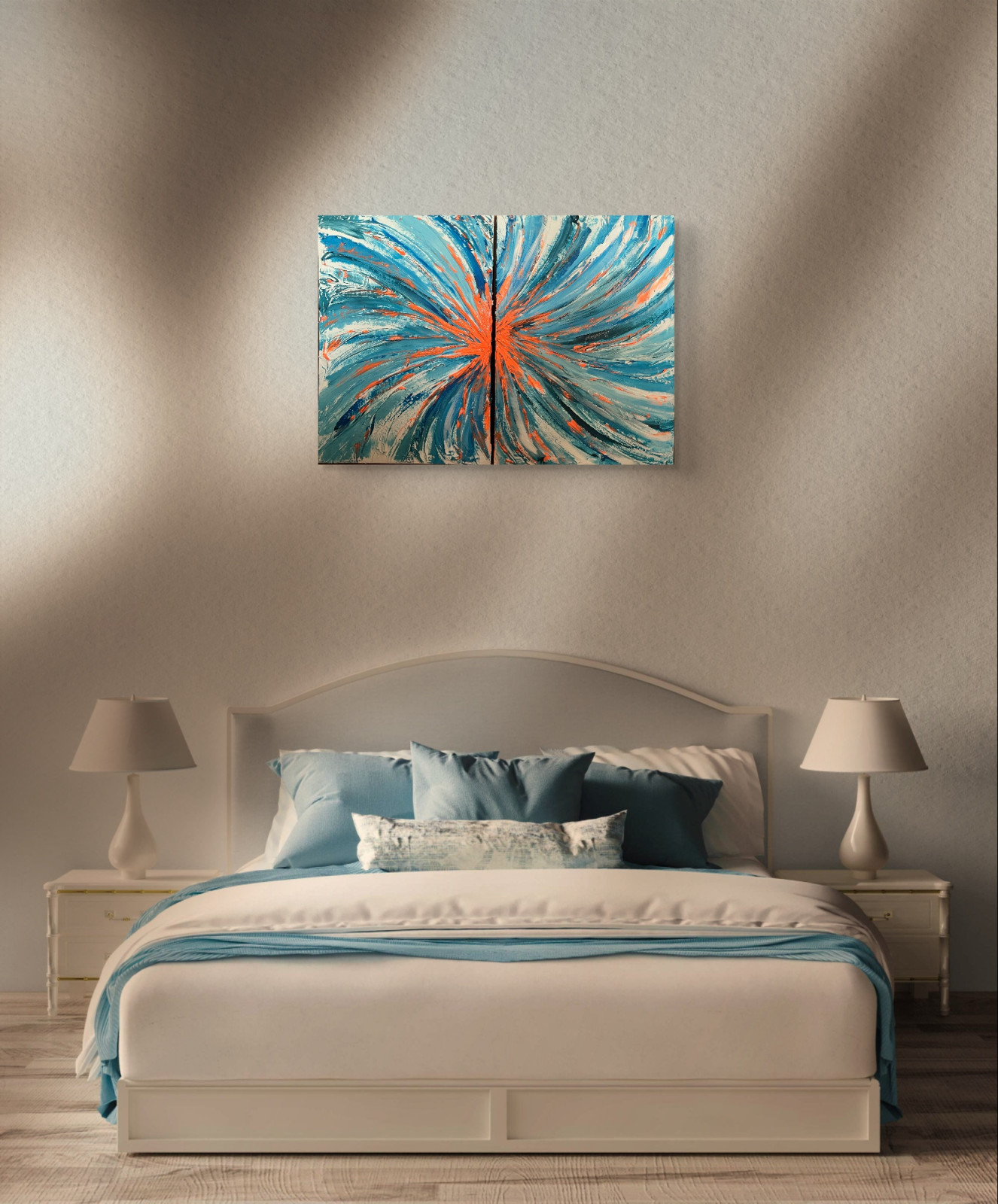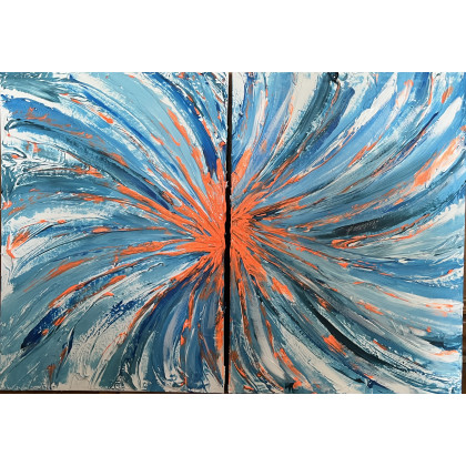 Dyptyk z bardzo ciekawą strukturą w odcieniach błękitu i pomarańczy. Delikatny a zarazem wyrazisty obraz ożywi każde wnętrze.