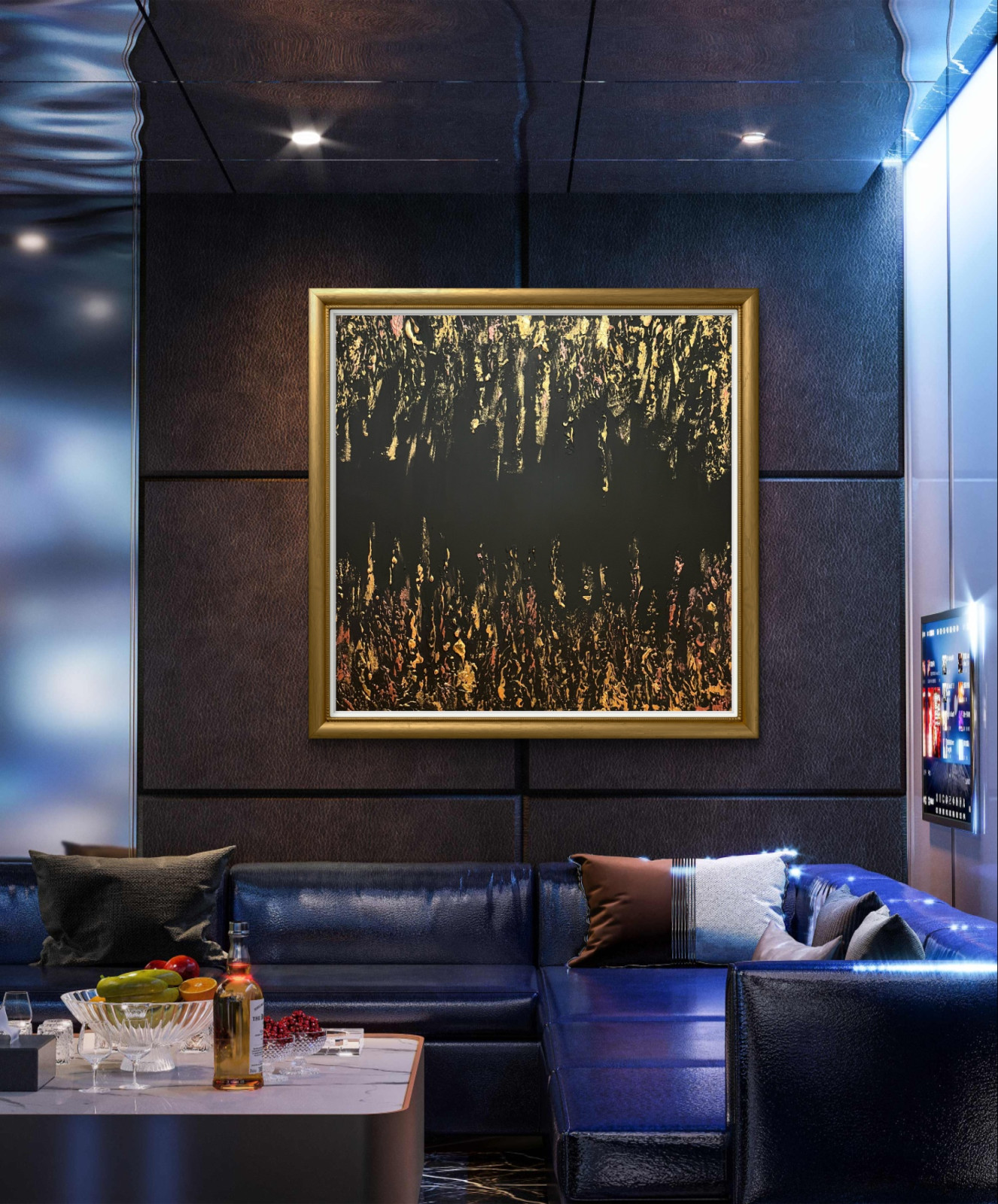 Abstrakcyjny obraz w rozmiarze 100x100 wszystkie boki ma zamalowane stworzony w technice mieszanej: struktura, szpachla, farby akrylowe, z dodatkiem płatków złota.