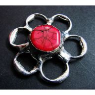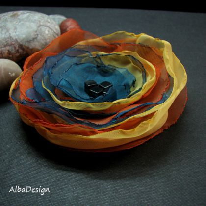 Elegancka broszka wykonana z materiału w kolorze żółto - buraczkowym - kobaltowo - pomarańczowym, zabezpieczona przed strzępieniem. Ozdobiona kamyczkami, hematytami. Posiada tradycyjne zapięcie. Średnica ok 10 cm. POLECAM !!