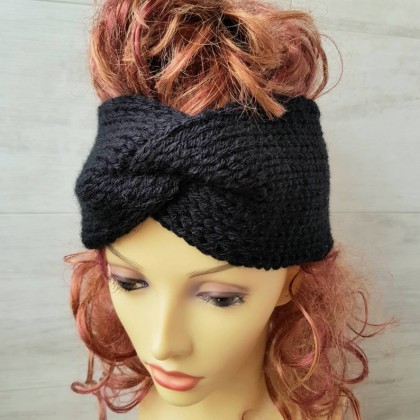Szeroka opaska ręcznie robiona, na drutach z włóczki o składzie 50% wełna/ 50 % akryl. Wzór podwójny, obie strony są takie same.