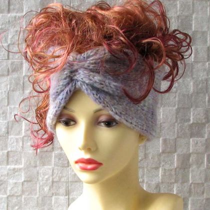 Szeroka opaska na głowę wykonana ręcznie na drutach z mieszanki wełny moheru, akrylu i nylonu.