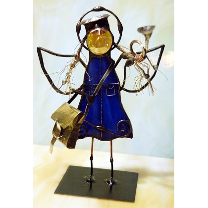 Aniołek witrażowy wykonany z wysokiej jakości szkła witrażowego spectrum (USA) i metali kolorowych (miedź, mosiądz, cyna). Wykonanie technika Tiffany. Wykonany w formie przestrzennej 3D. Patynowany na czarno. Wysokość aniołka 13 cm, podstawka 6 x 6 cm.