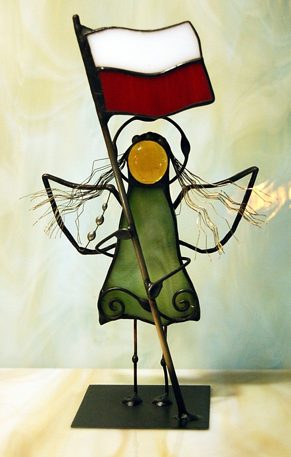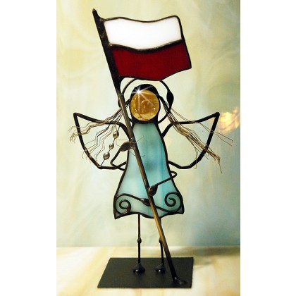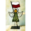 Aniołek witrażowy wykonany z wysokiej jakości szkła witrażowego spectrum (USA) i metali kolorowych (miedź, mosiądz, cyna). Wykonanie technika Tiffany. Patynowany na czarno. Wysokość aniołka 13 cm, flaga16 cm, podstawka 6 x 6 cm.