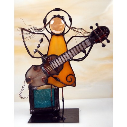 Aniołek 3D z gitarą basową i wzmacniaczem jest wykonany z wysokiej jakości szkła witrażowego spectrum, miedzi ,mosiądzu i cyny. Wykonanie w technice Tiffany. Patynowany na czarno. Wysokość aniołka 13 cm, podstawka 6 x 6 cm.