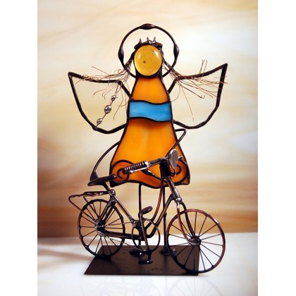 Aniołek jest wykonany z wysokiej jakości szkła witrażowego spectrum, miedzi ,mosiądzu i cyny. Wykonanie w technice Tiffany. Patynowany na czarno. Wysokość aniołka 13 cm, podstawka 6 x 6 cm.