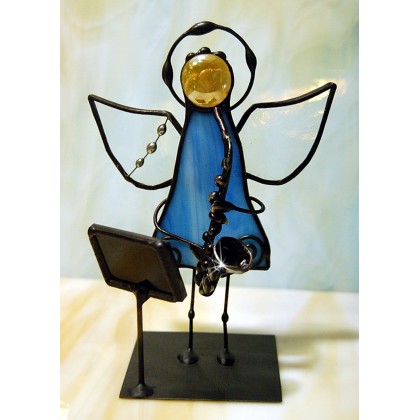 Aniołek jest wykonany z wysokiej jakości szkła witrażowego spectrum, miedzi ,mosiądzu i cyny. Wykonanie w technice Tiffany. Patynowany na czarno. Wysokość aniołka 13 cm, podstawka 6 x 6 cm.
