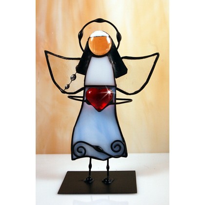 Aniołek witrażowy zakonnica z sercem wykonany z wysokiej jakości szkła witrażowego spectrum (USA) i metali kolorowych (miedź, mosiądz, cyna). Wykonanie technika Tiffany. Aniołek w formie przestrzennej 3D. Patynowany na czarno. Wysokość aniołka 13 cm, podstawka 6 x 6 cm.