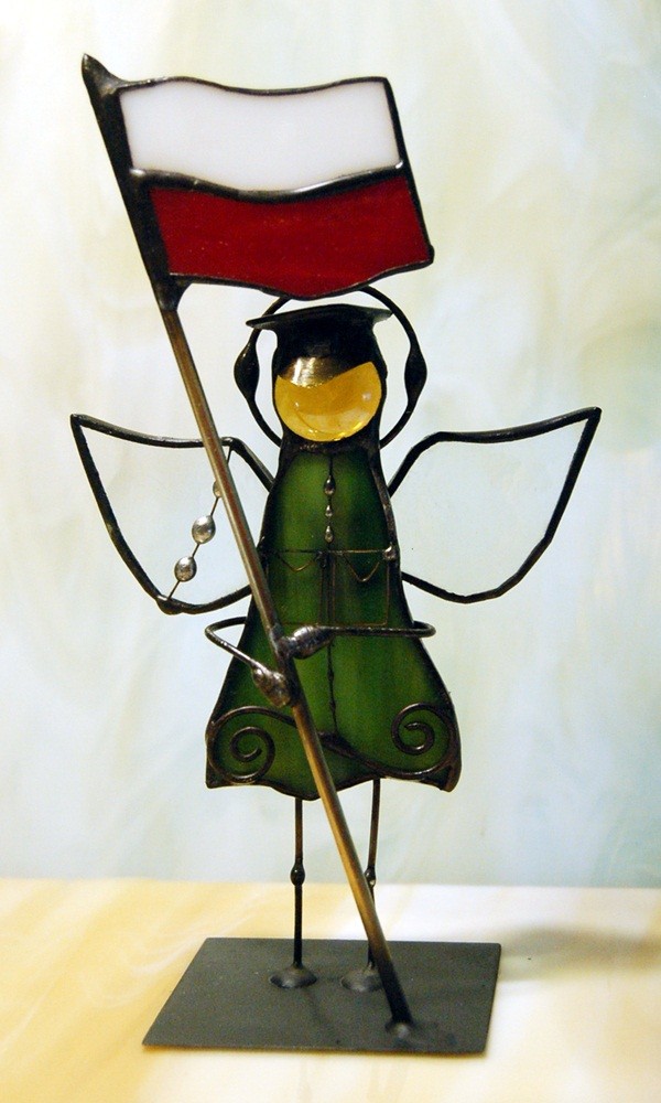 Aniołek witrażowy 3D żołnierz z flagą Wysokość flagi 16 cm.. Wykonany z wysokiej jakości szkła witrażowego spectrum (USA) i metali kolorowych (miedź, mosiądz, cyna). Wykonanie technika Tiffany. Patynowany na czarno. Wysokość aniołka 13 cm, podstawka 6 x 6 cm.