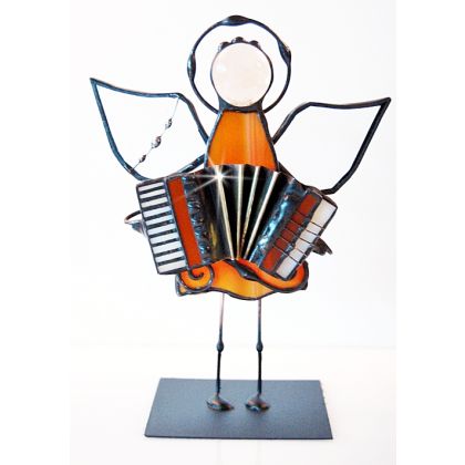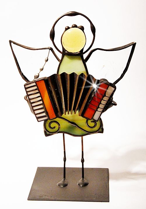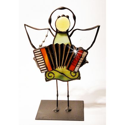 Aniołek witrażowy wykonany z wysokiej jakości szkła witrażowego spectrum (USA) i metali kolorowych (miedź, mosiądz, cyna). Wykonanie technika Tiffany. Patynowany na czarno. Wysokość aniołka 13 cm, podstawka 6 x 6 cm. Możliwy wybór różnej kolorystyki przez kupującego.